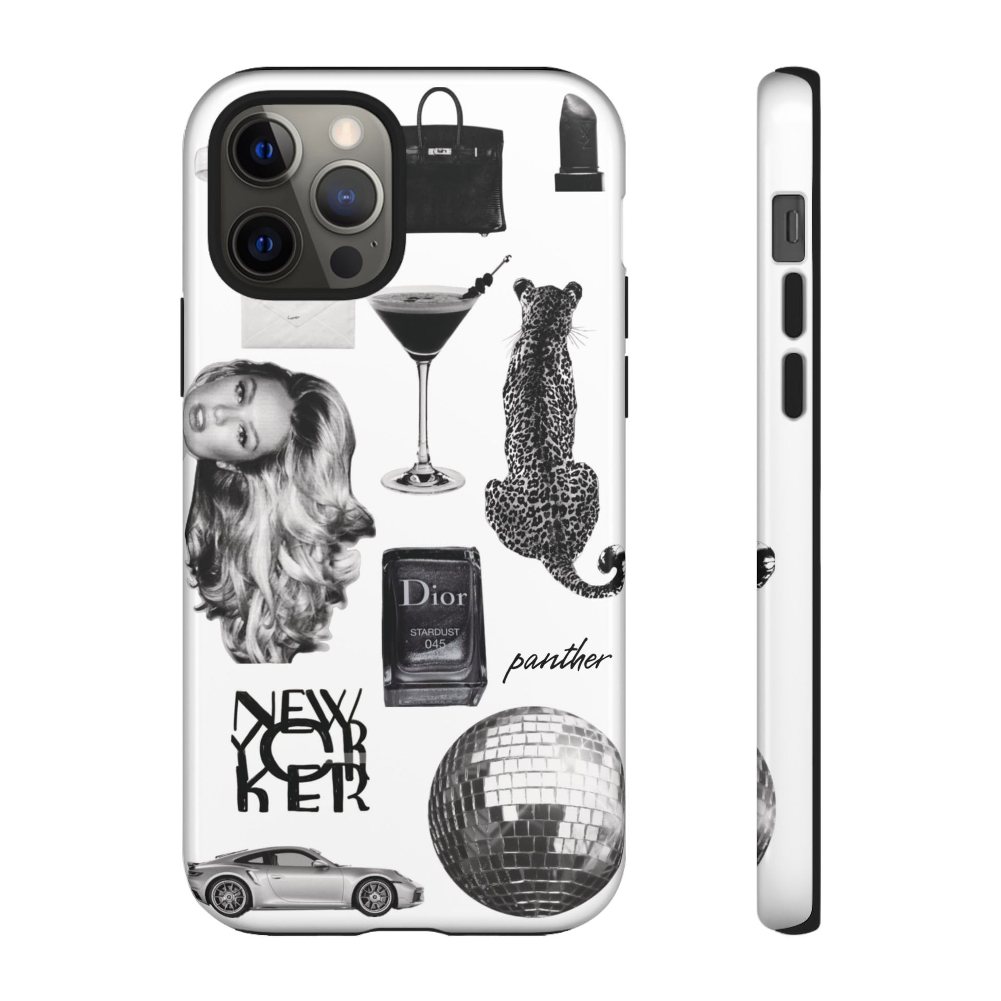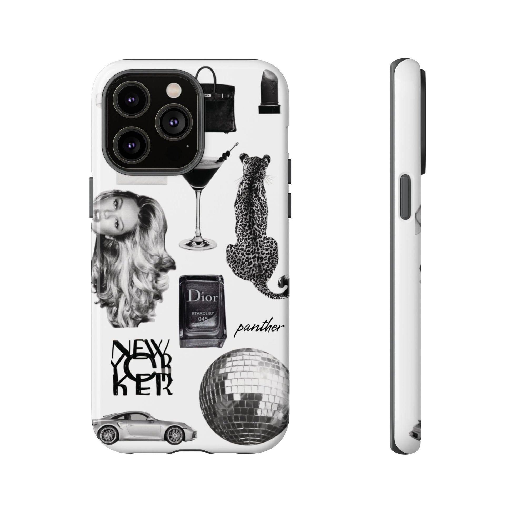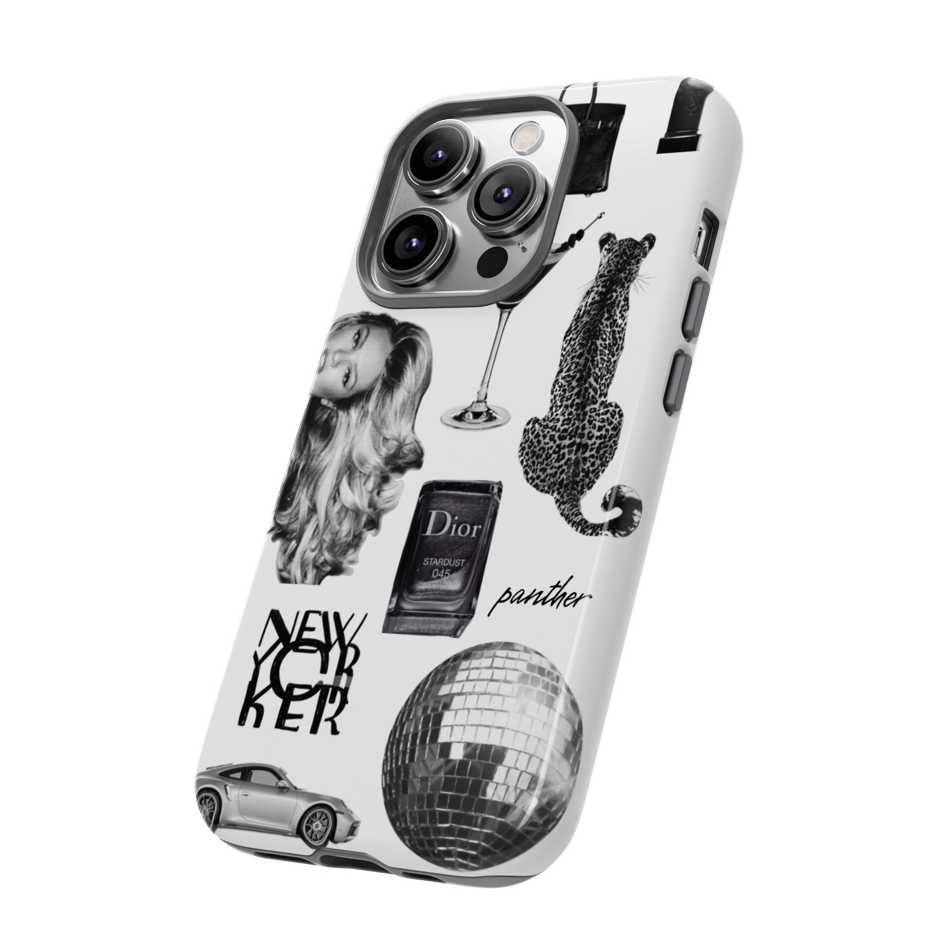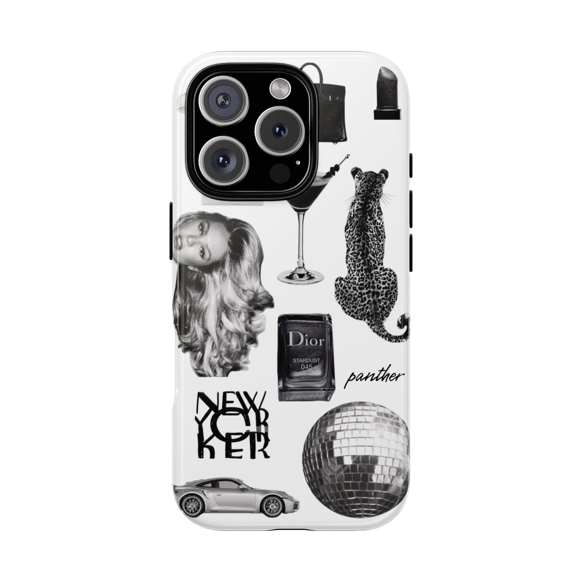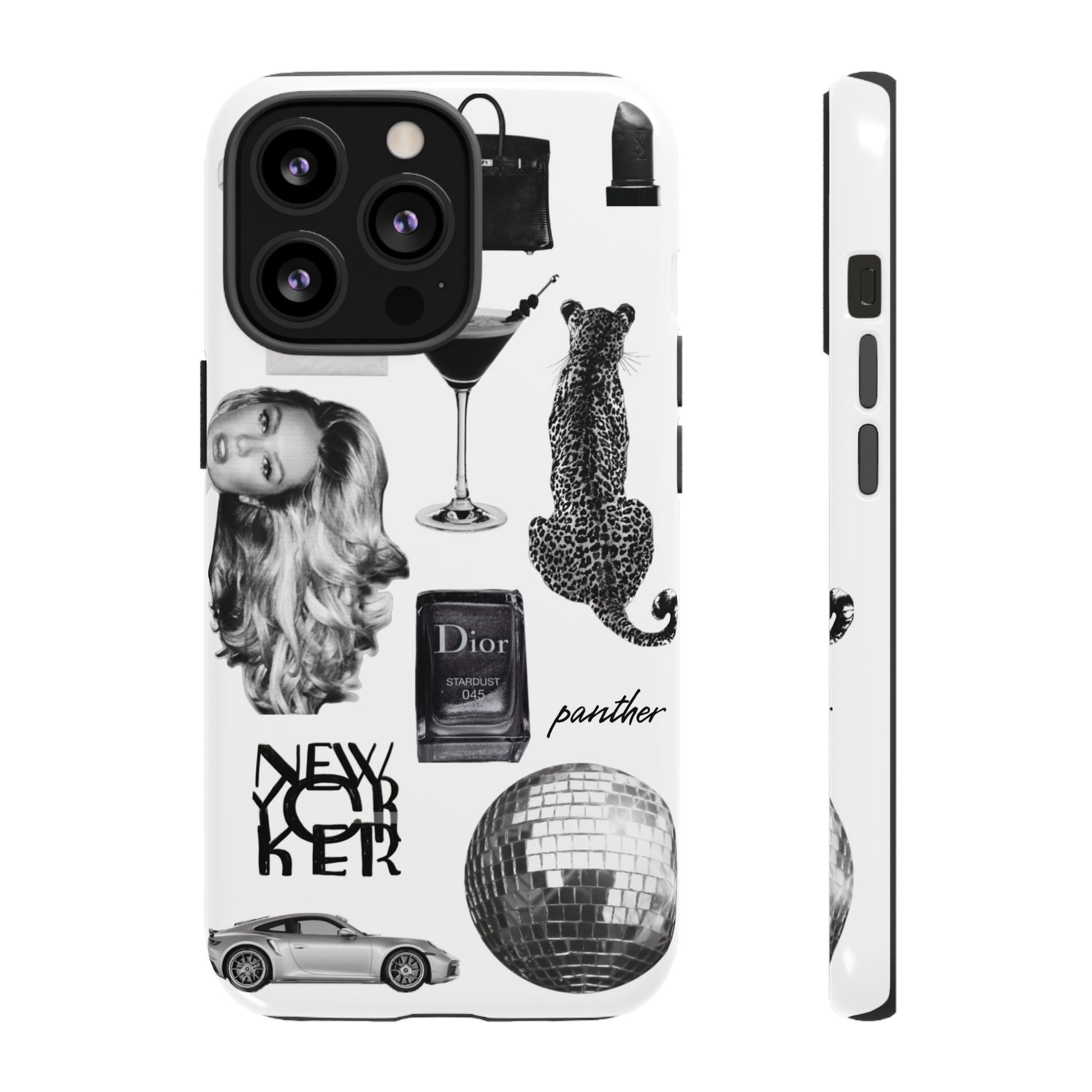This glamorous and chic phone case is perfect for anyone who loves bling and silver accents. Featuring a stylish leopard print and iconic New York and Porsche design elements, this case is sure to stand out.