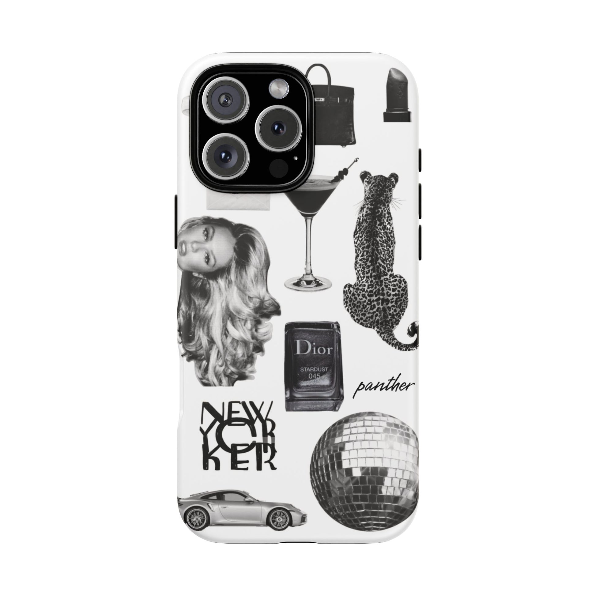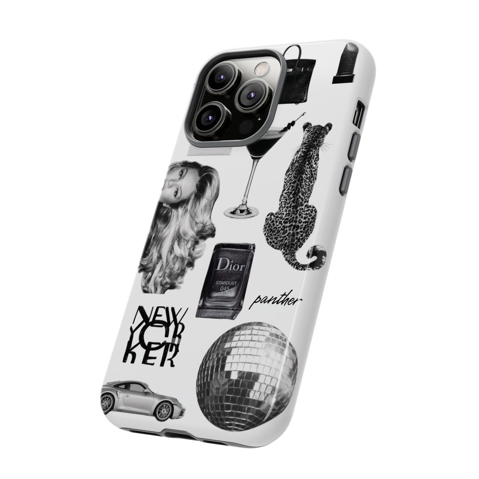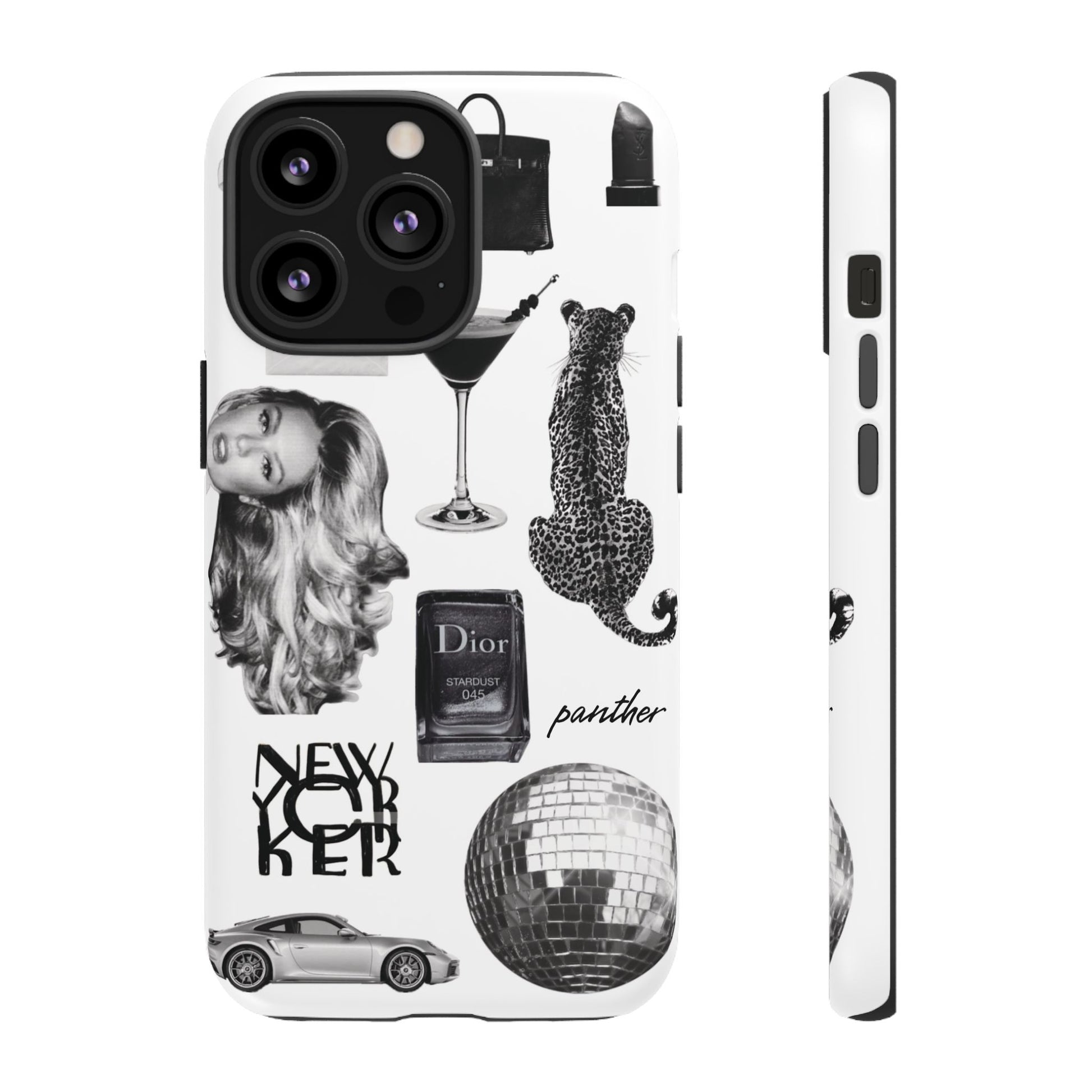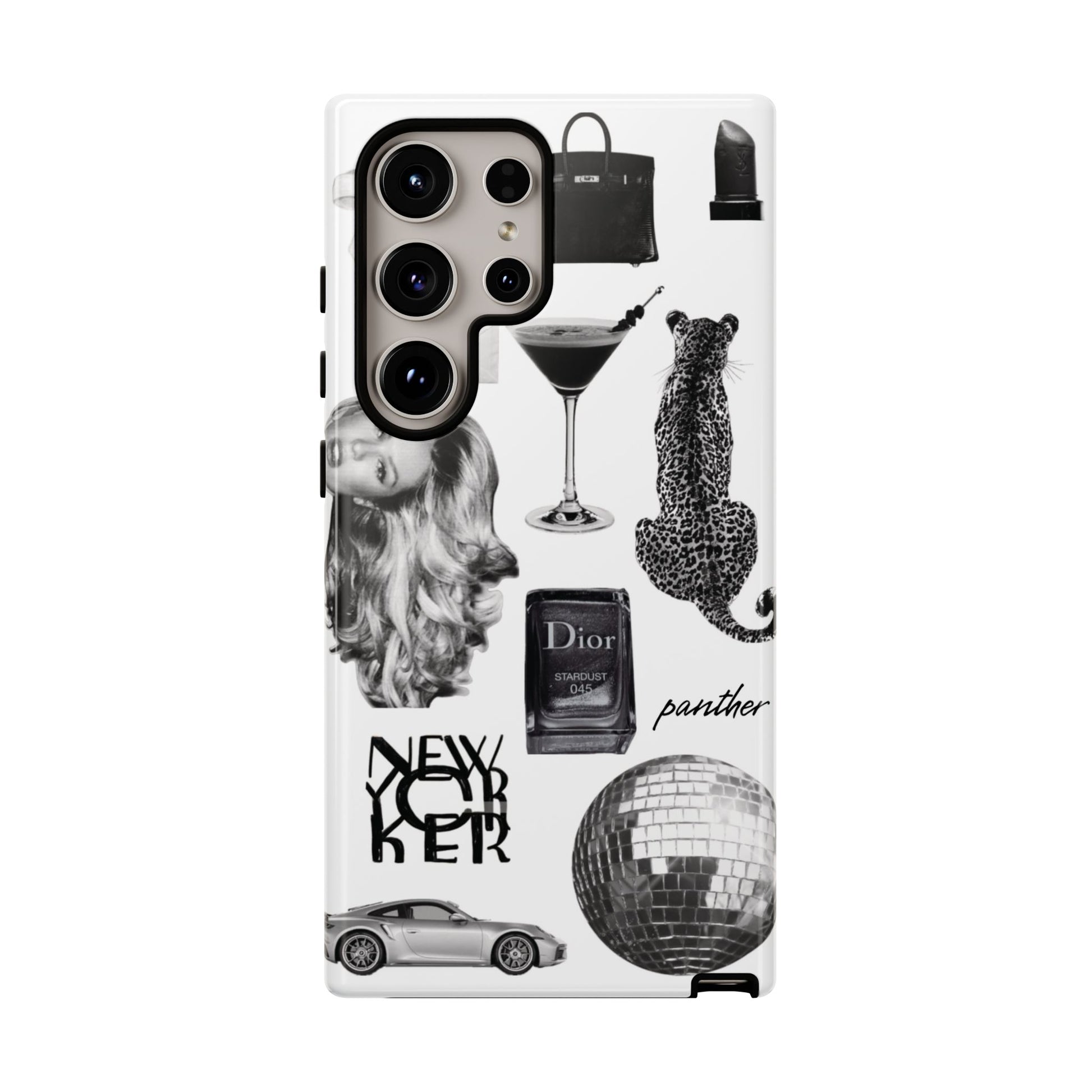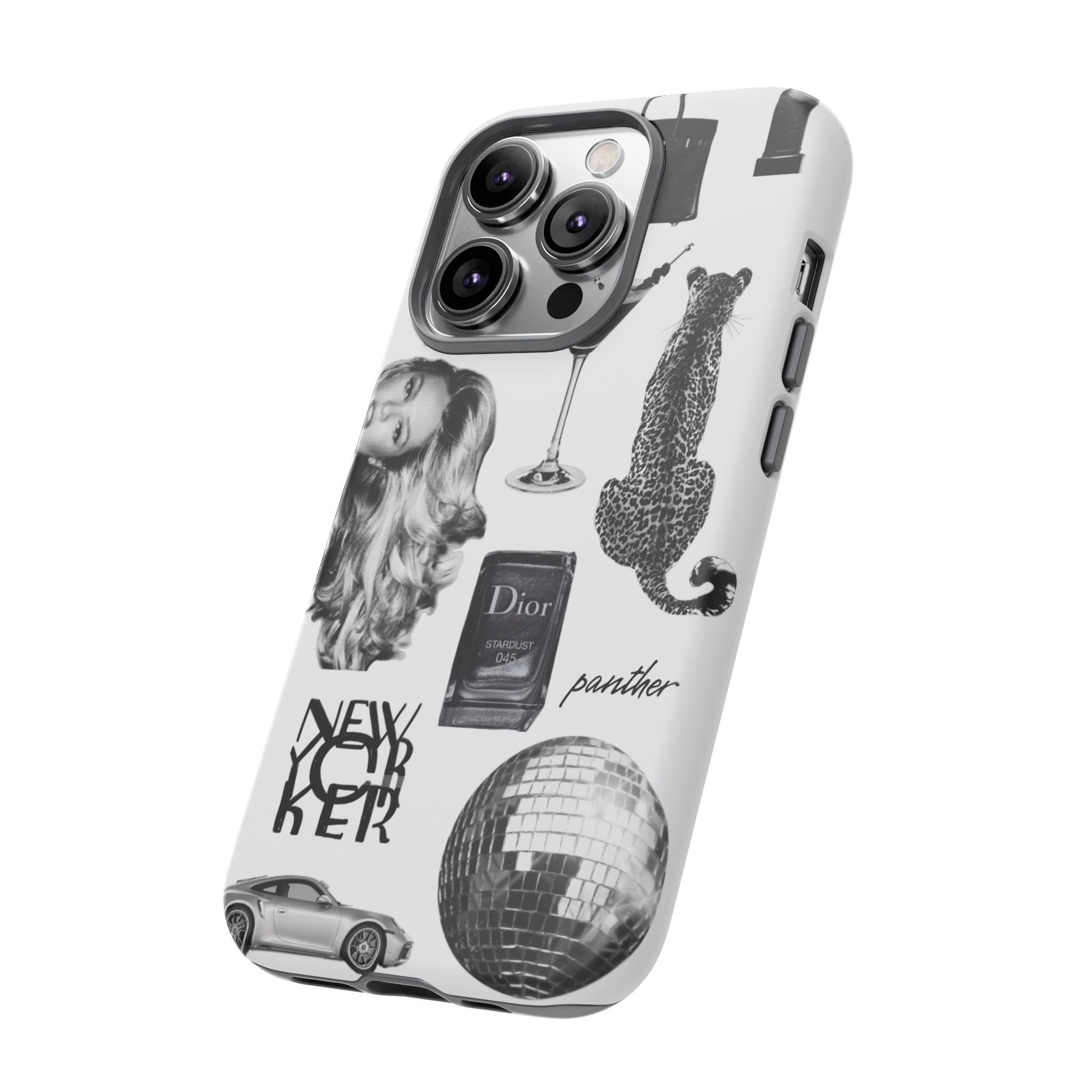 This glamorous and chic phone case is perfect for anyone who loves bling and silver accents. Featuring a stylish leopard print and iconic New York and Porsche design elements, this case is sure to stand out.