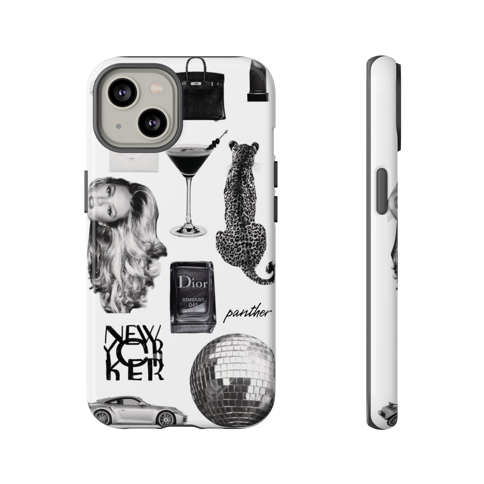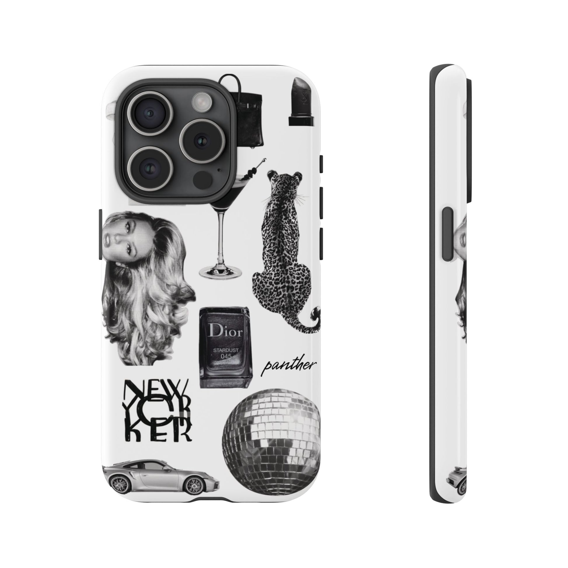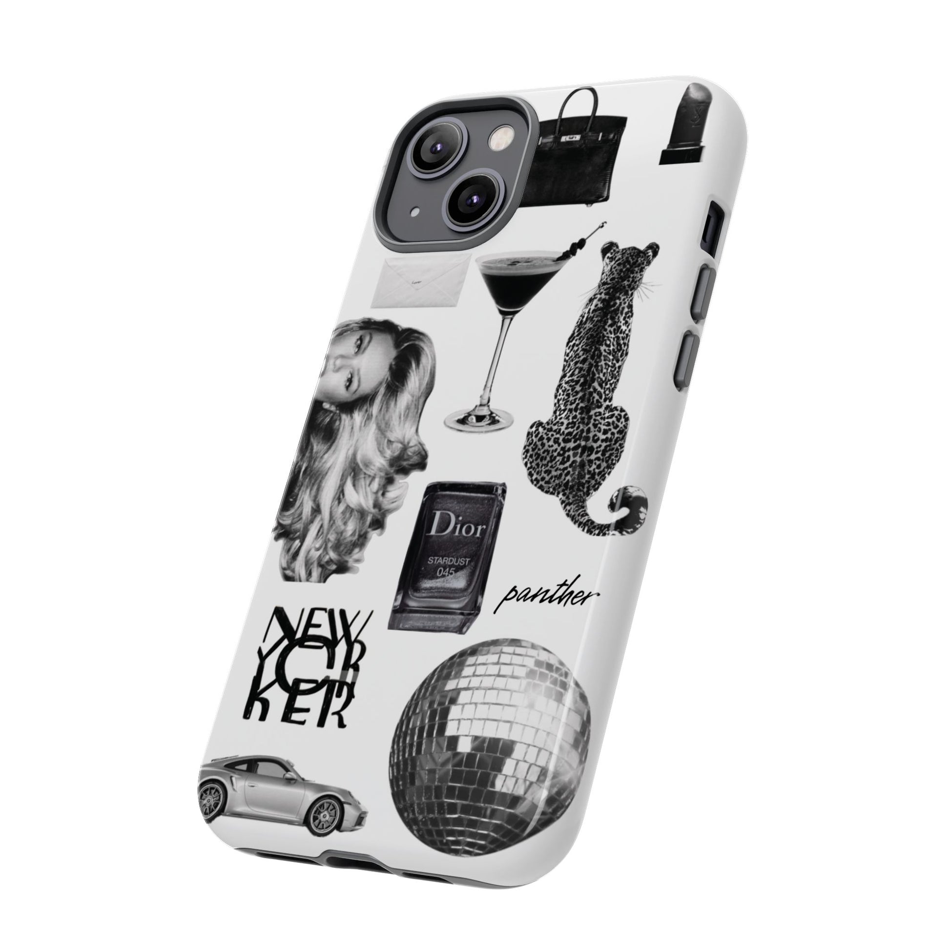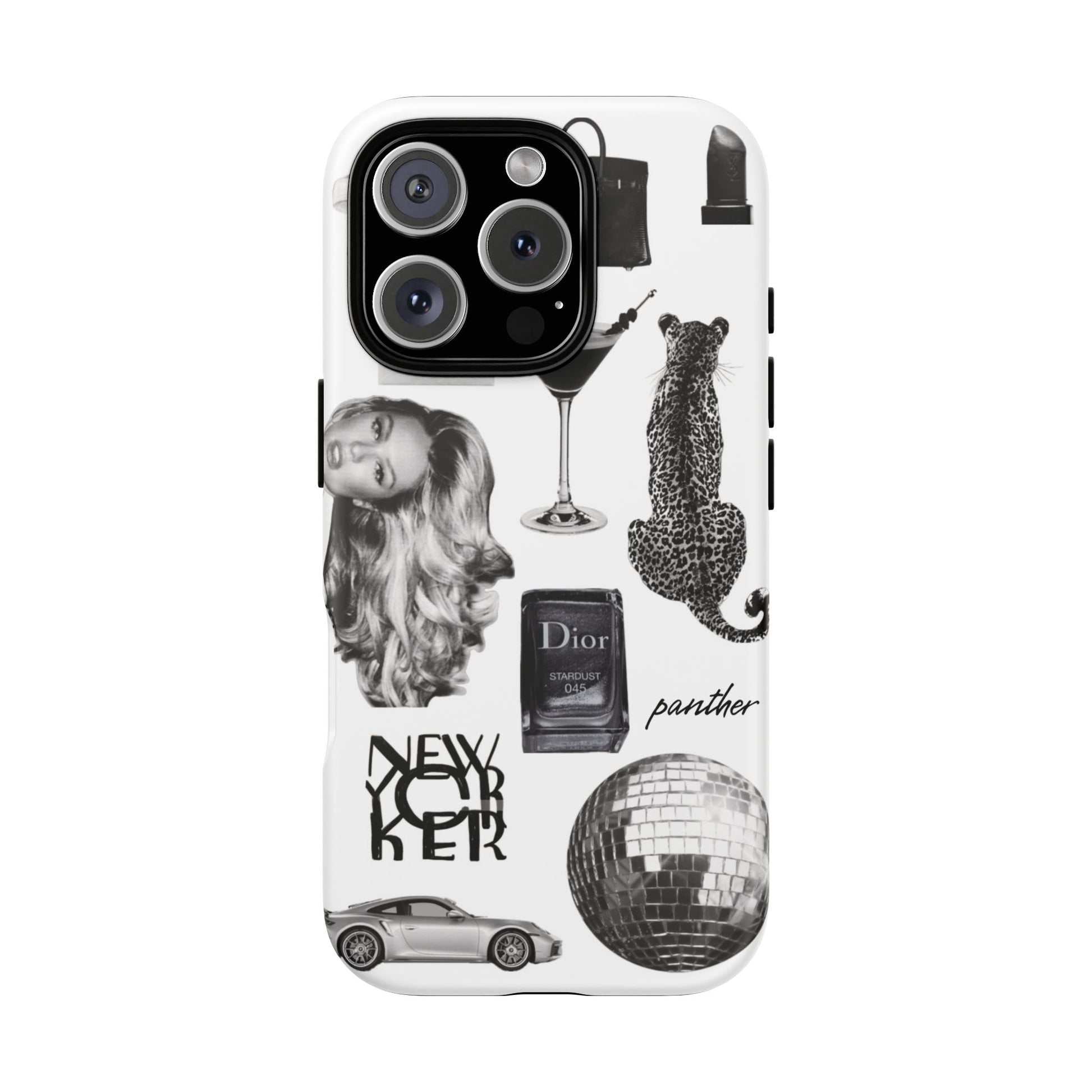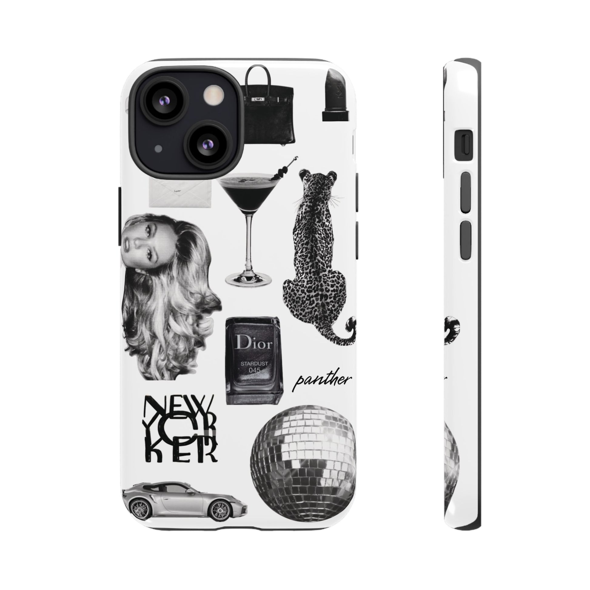 This glamorous and chic phone case is perfect for anyone who loves bling and silver accents. Featuring a stylish leopard print and iconic New York and Porsche design elements, this case is sure to stand out.