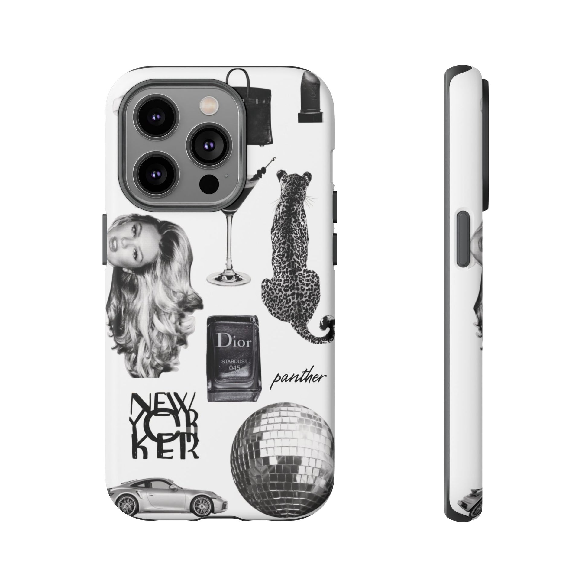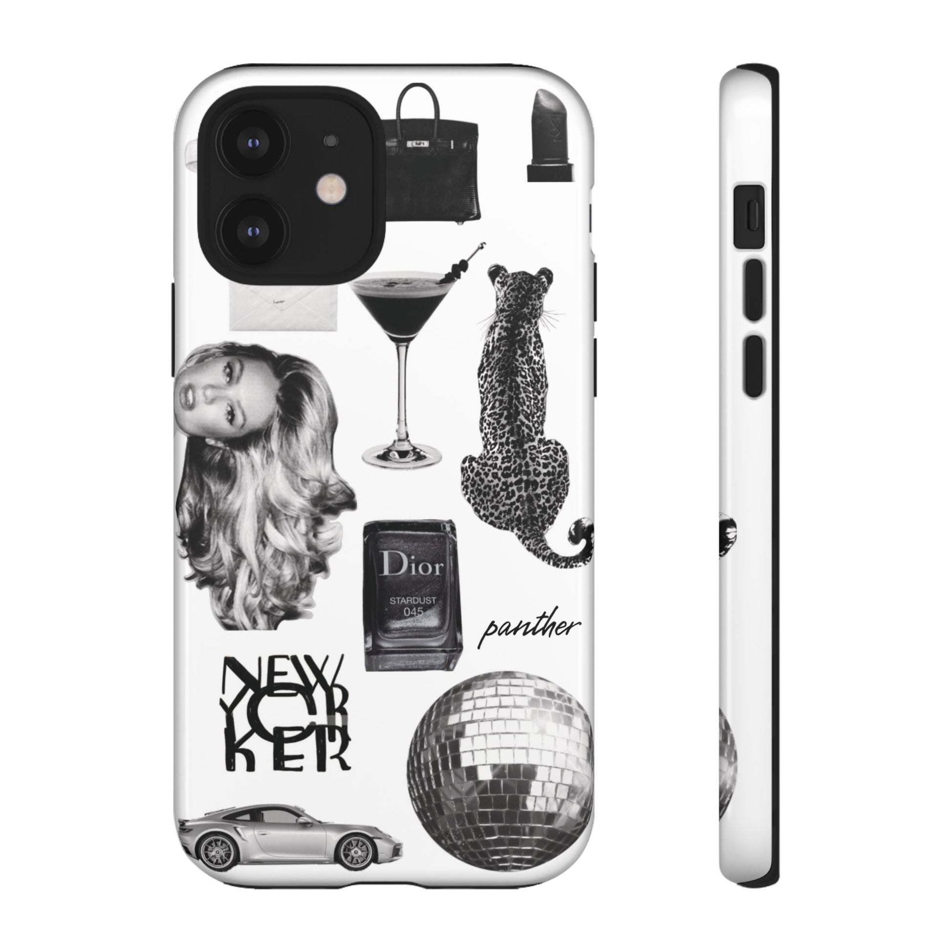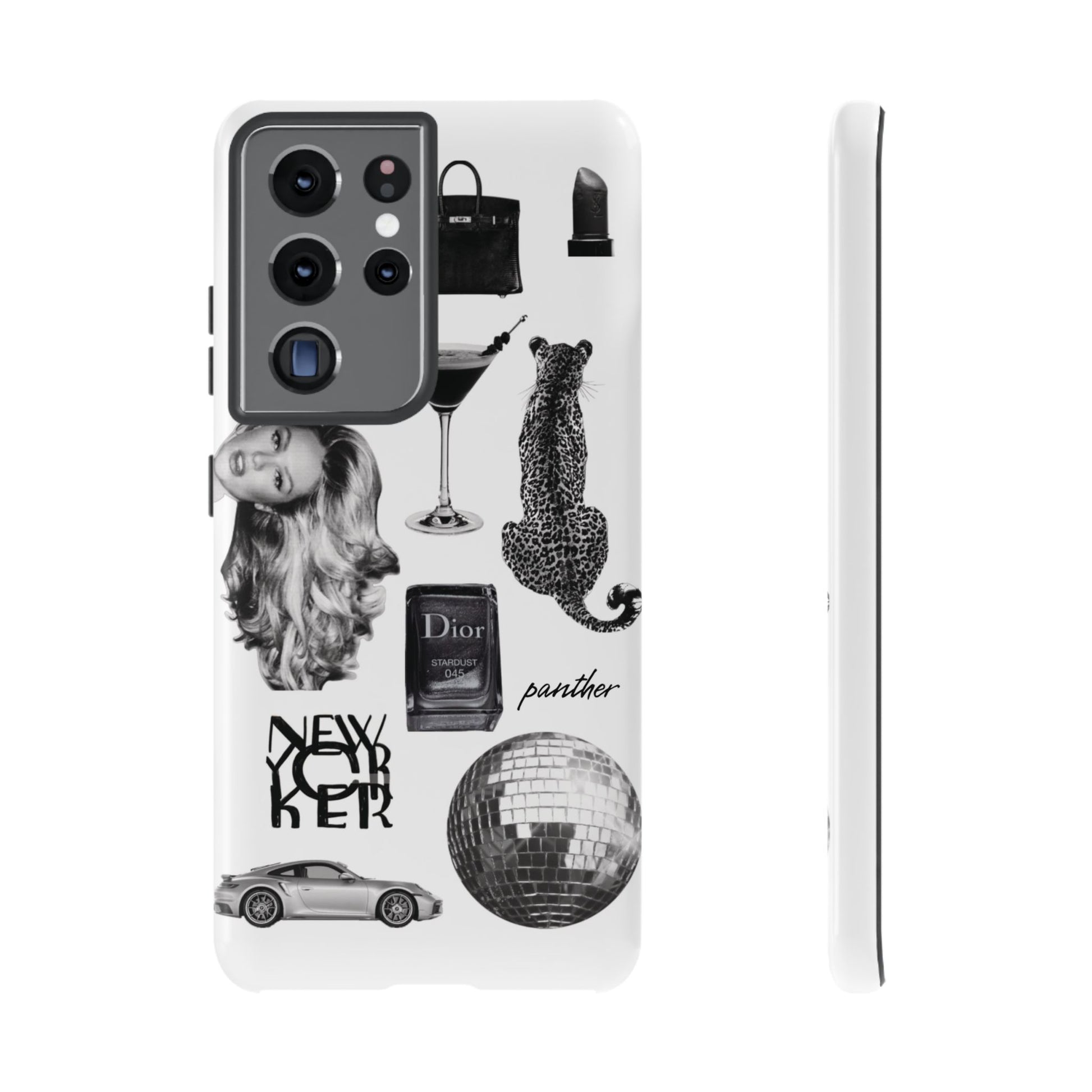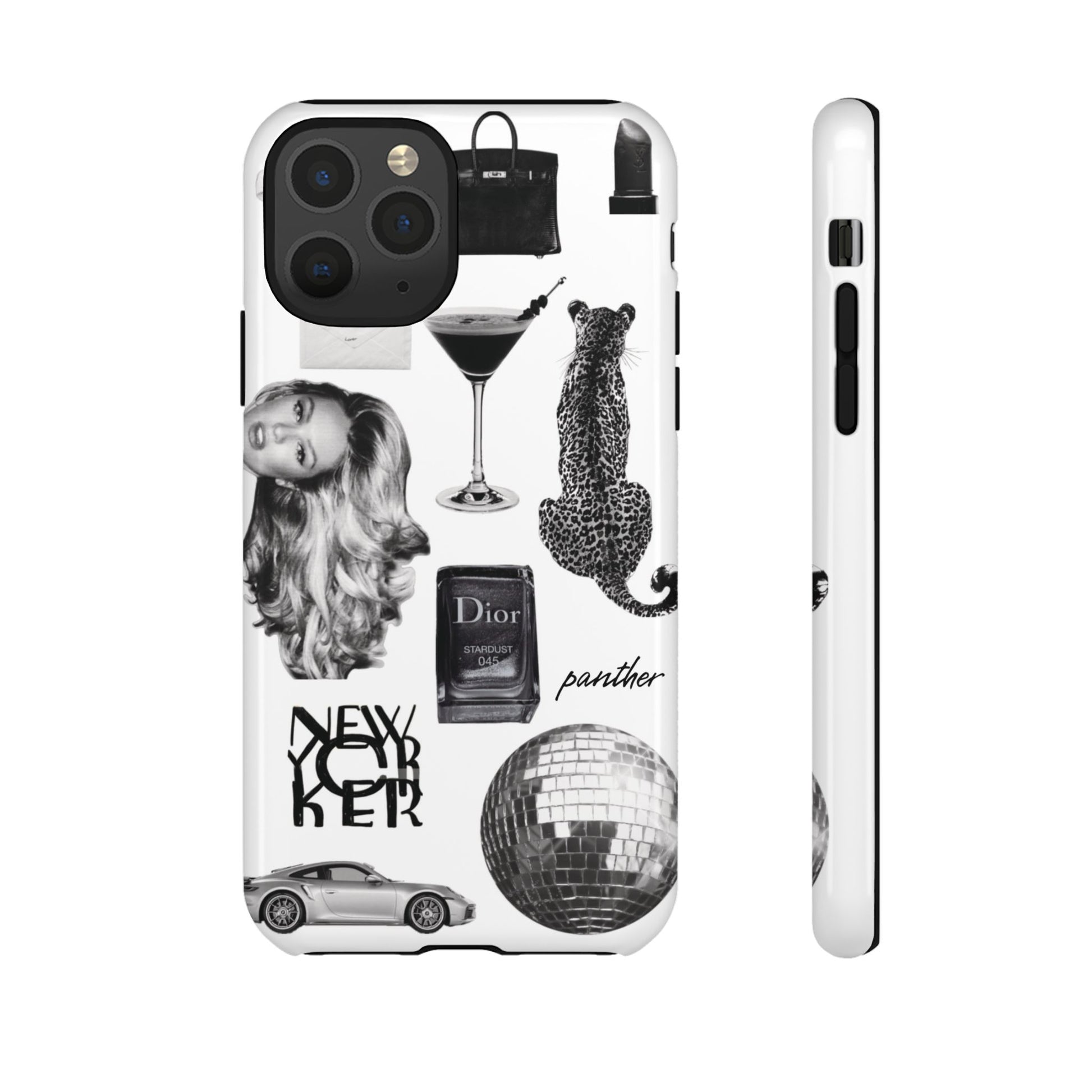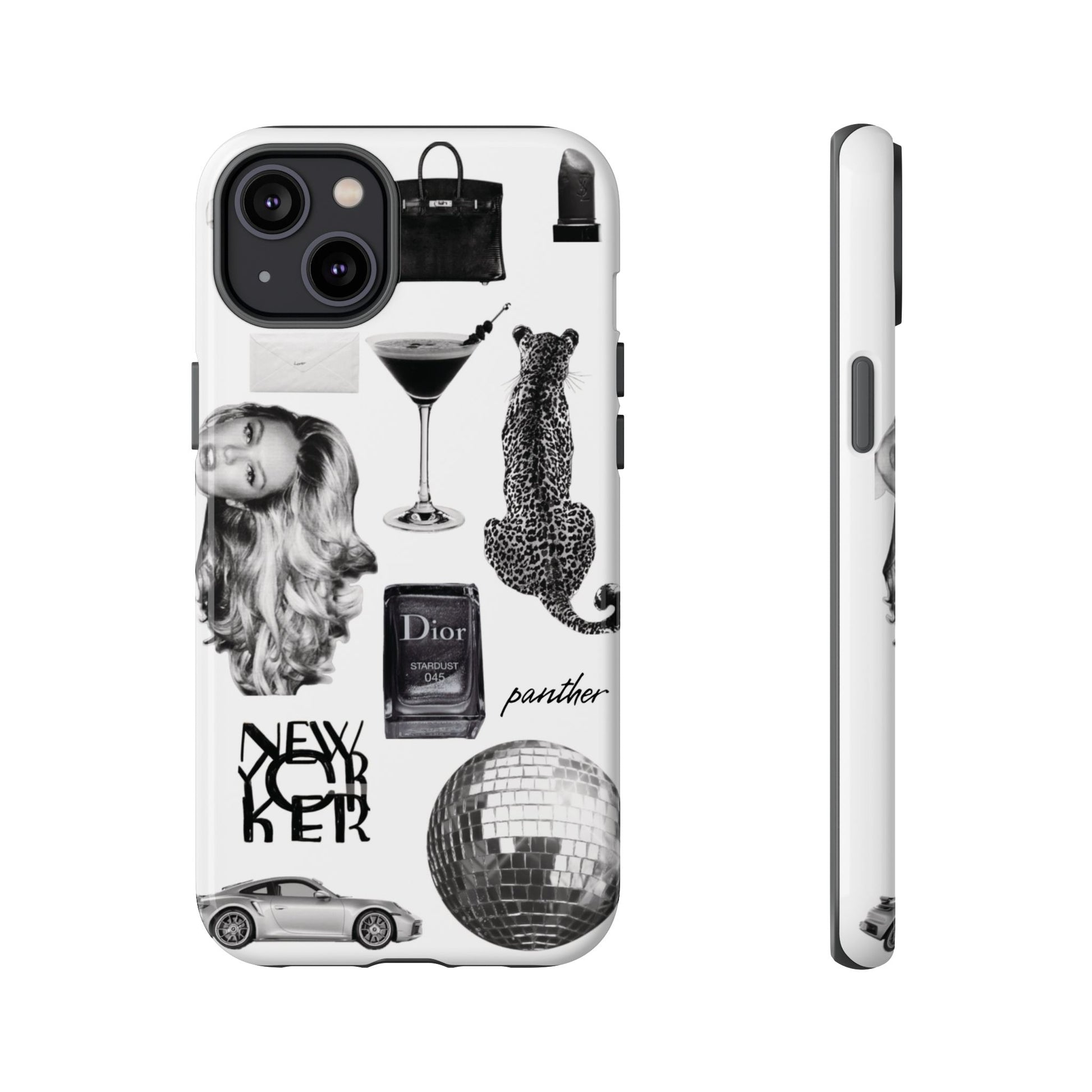 This glamorous and chic phone case is perfect for anyone who loves bling and silver accents. Featuring a stylish leopard print and iconic New York and Porsche design elements, this case is sure to stand out.