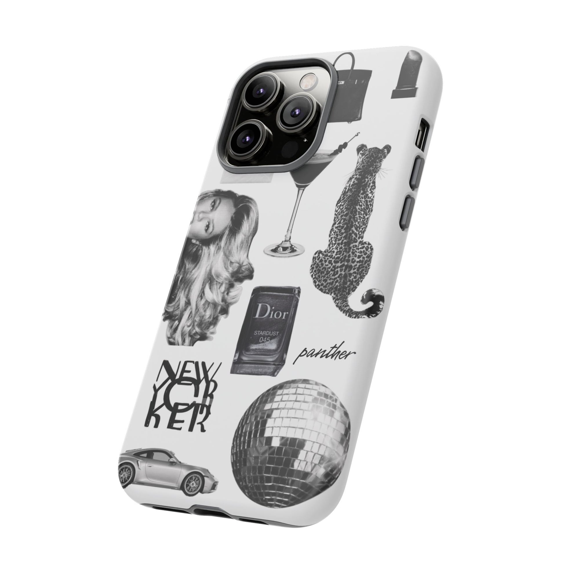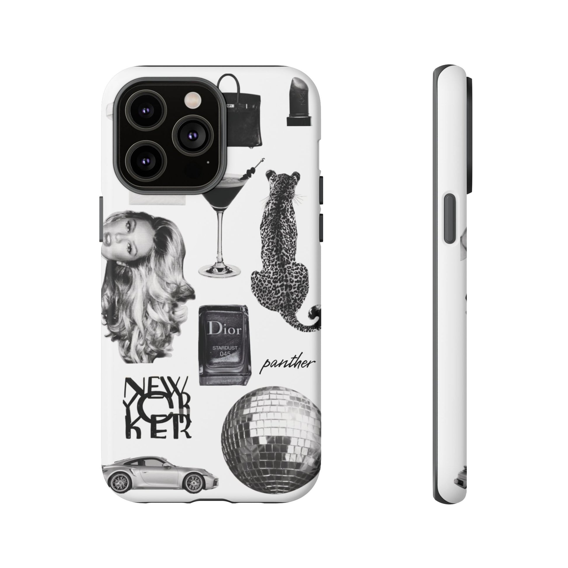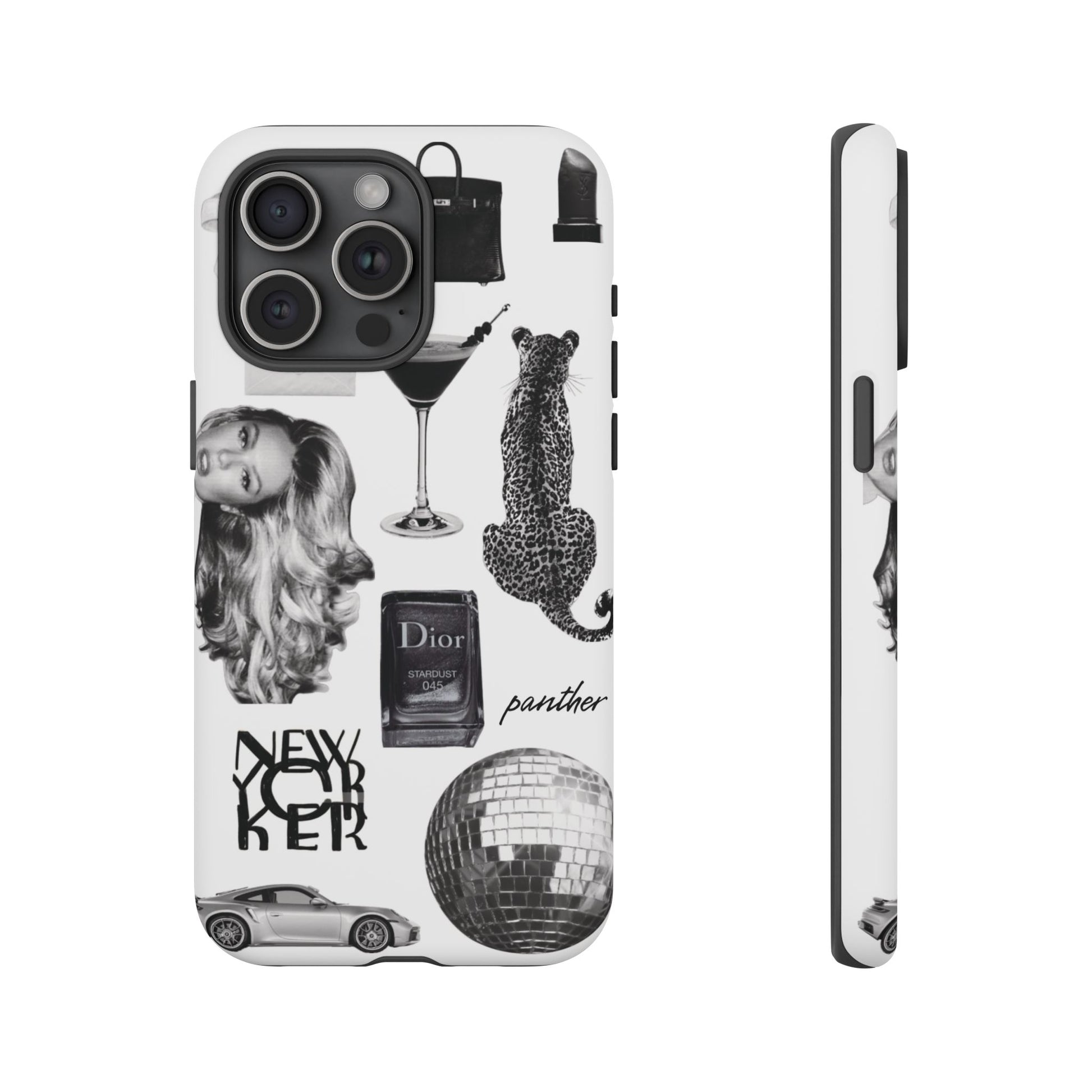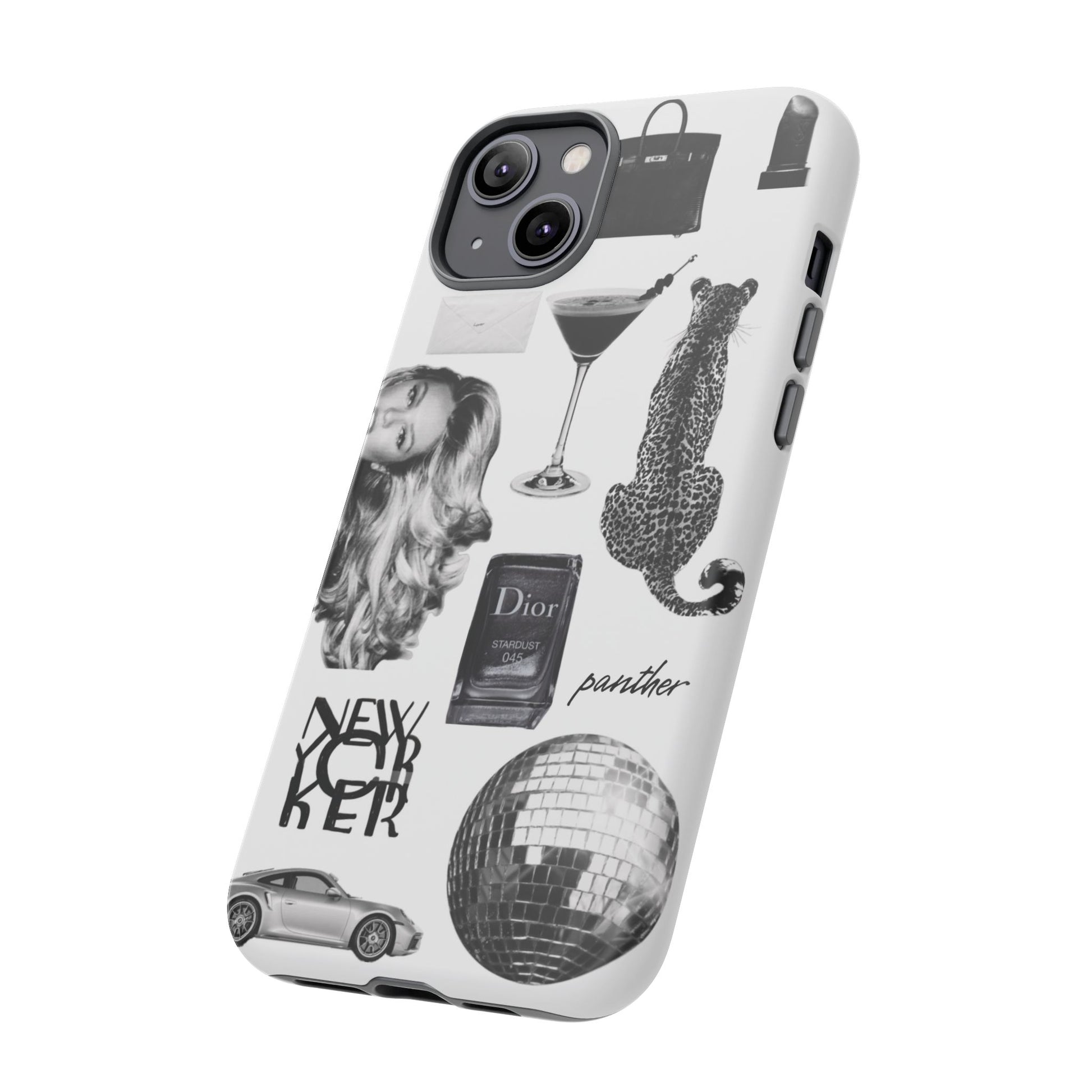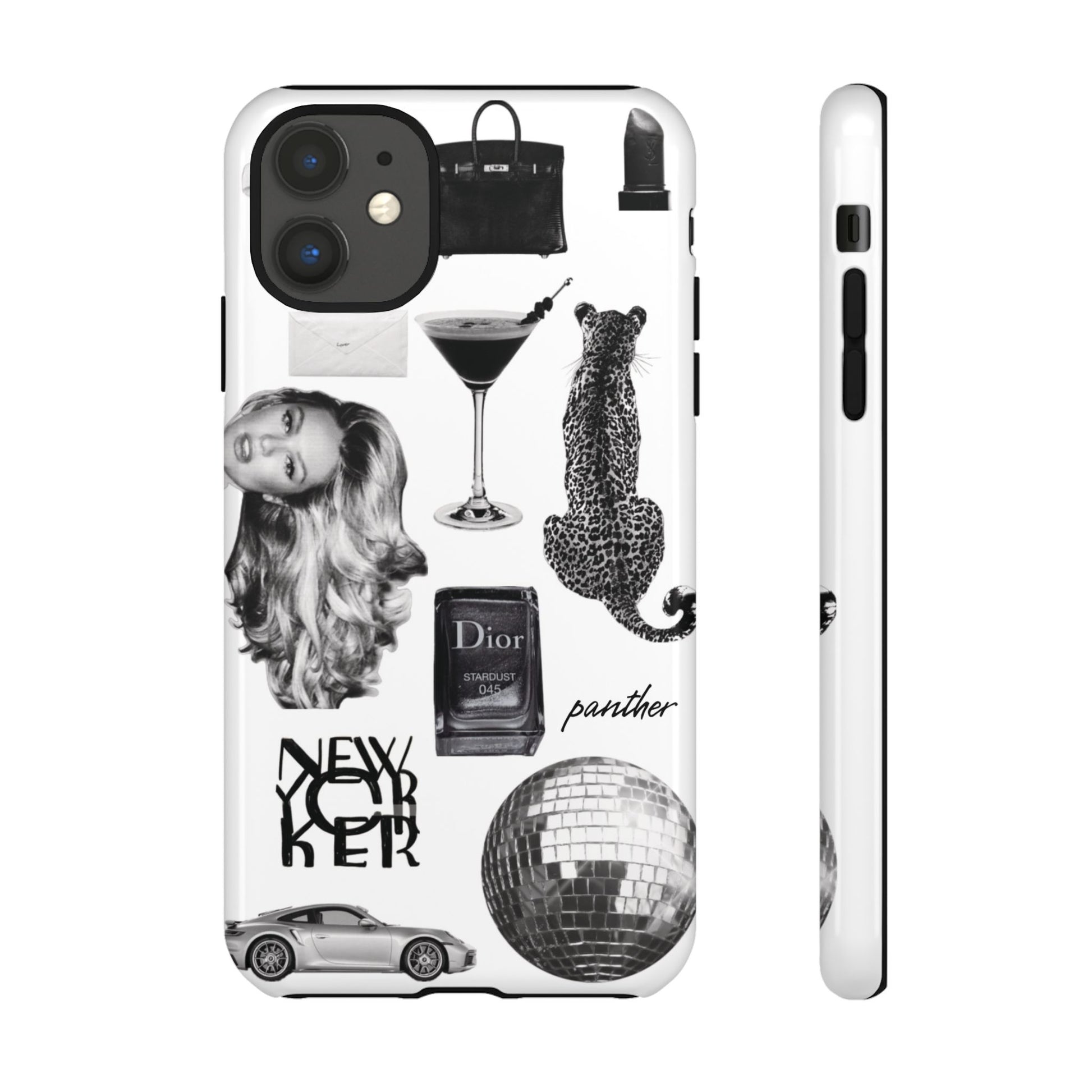 This glamorous and chic phone case is perfect for anyone who loves bling and silver accents. Featuring a stylish leopard print and iconic New York and Porsche design elements, this case is sure to stand out.