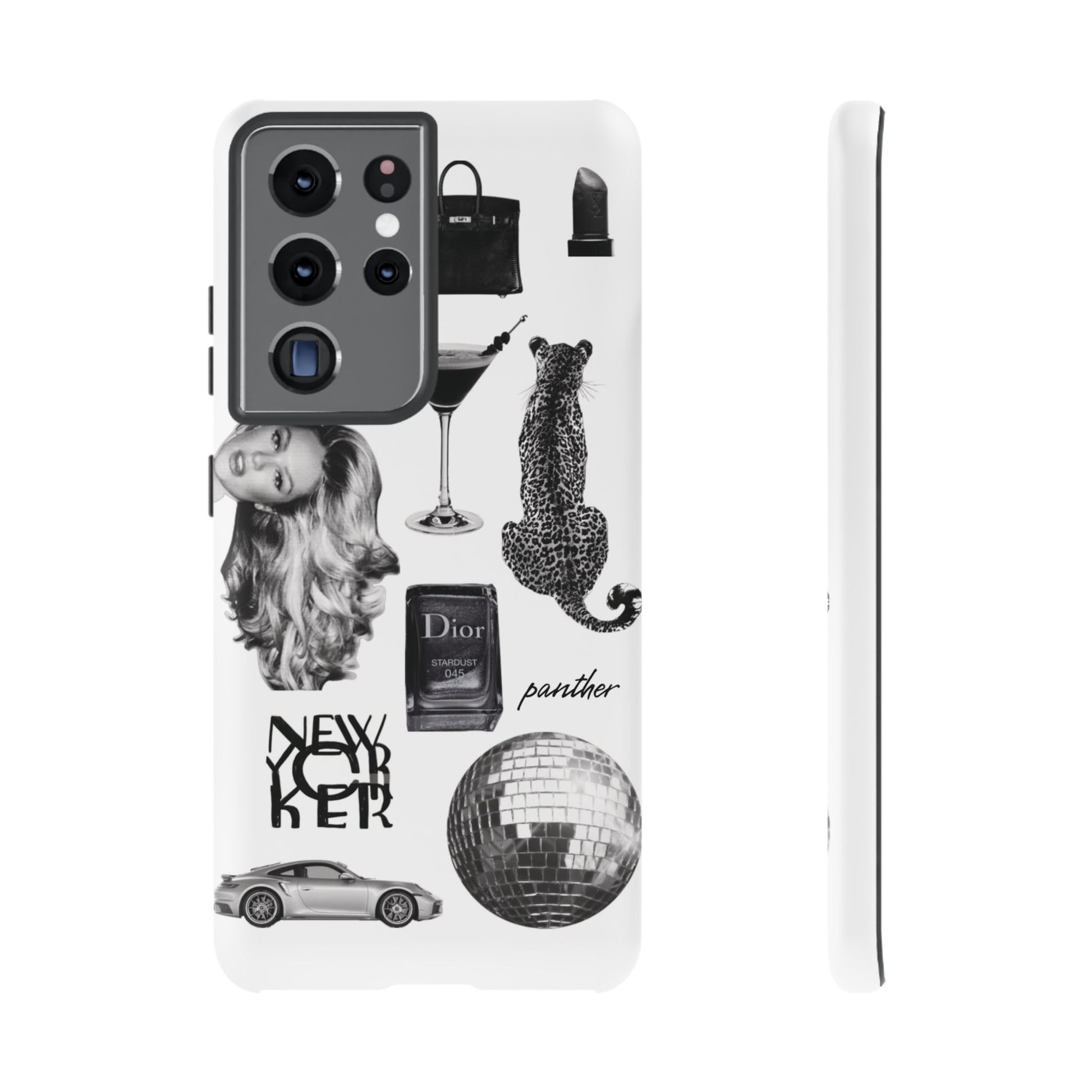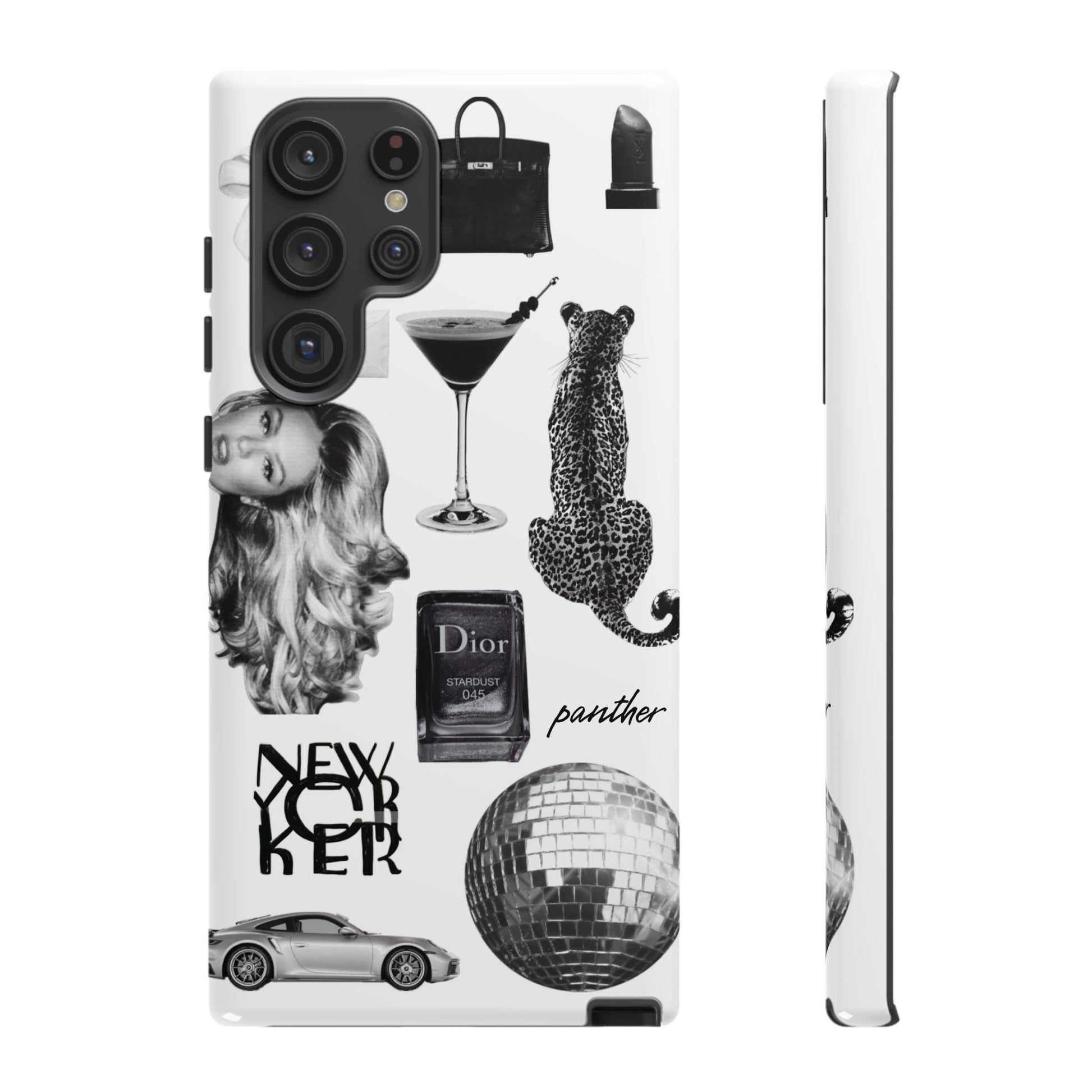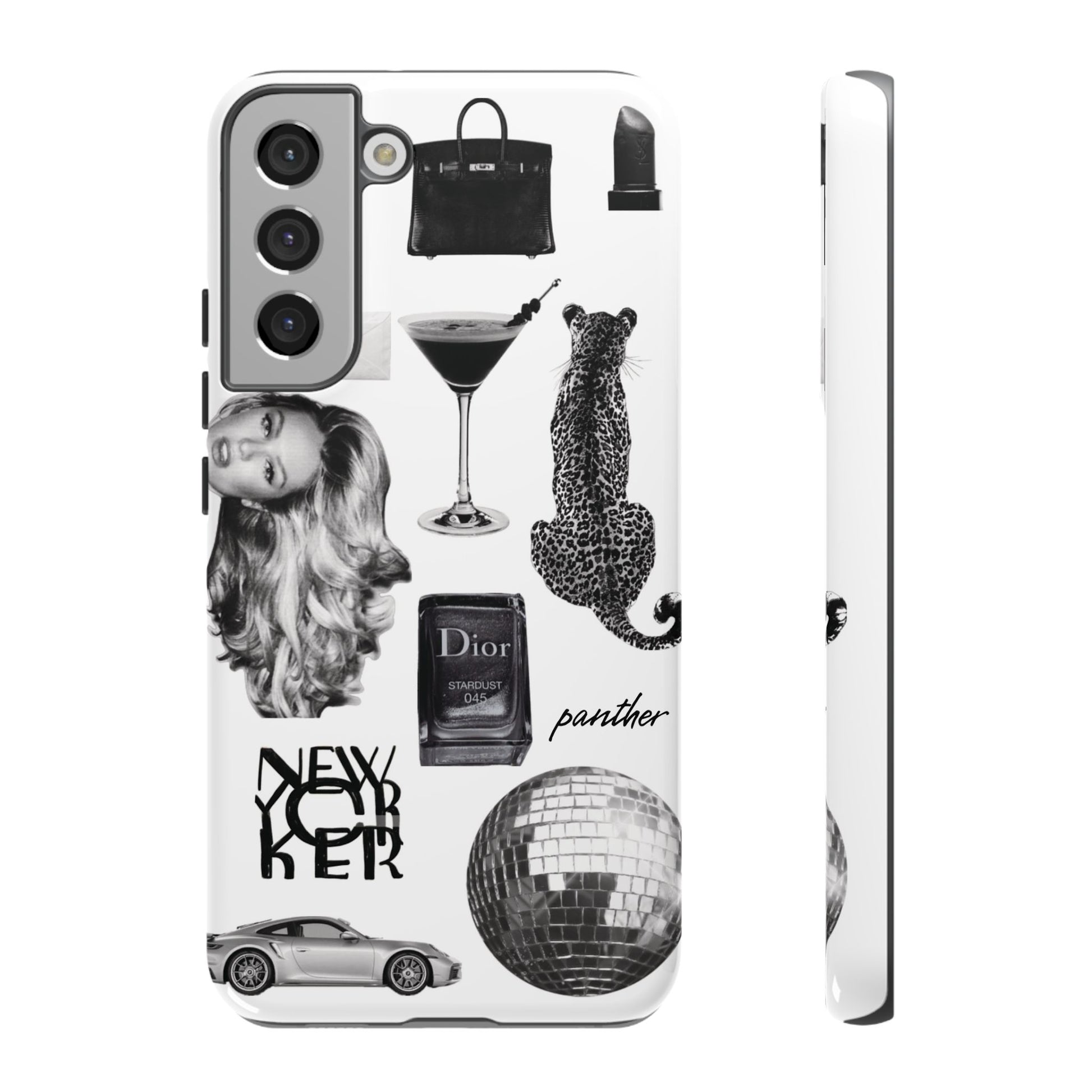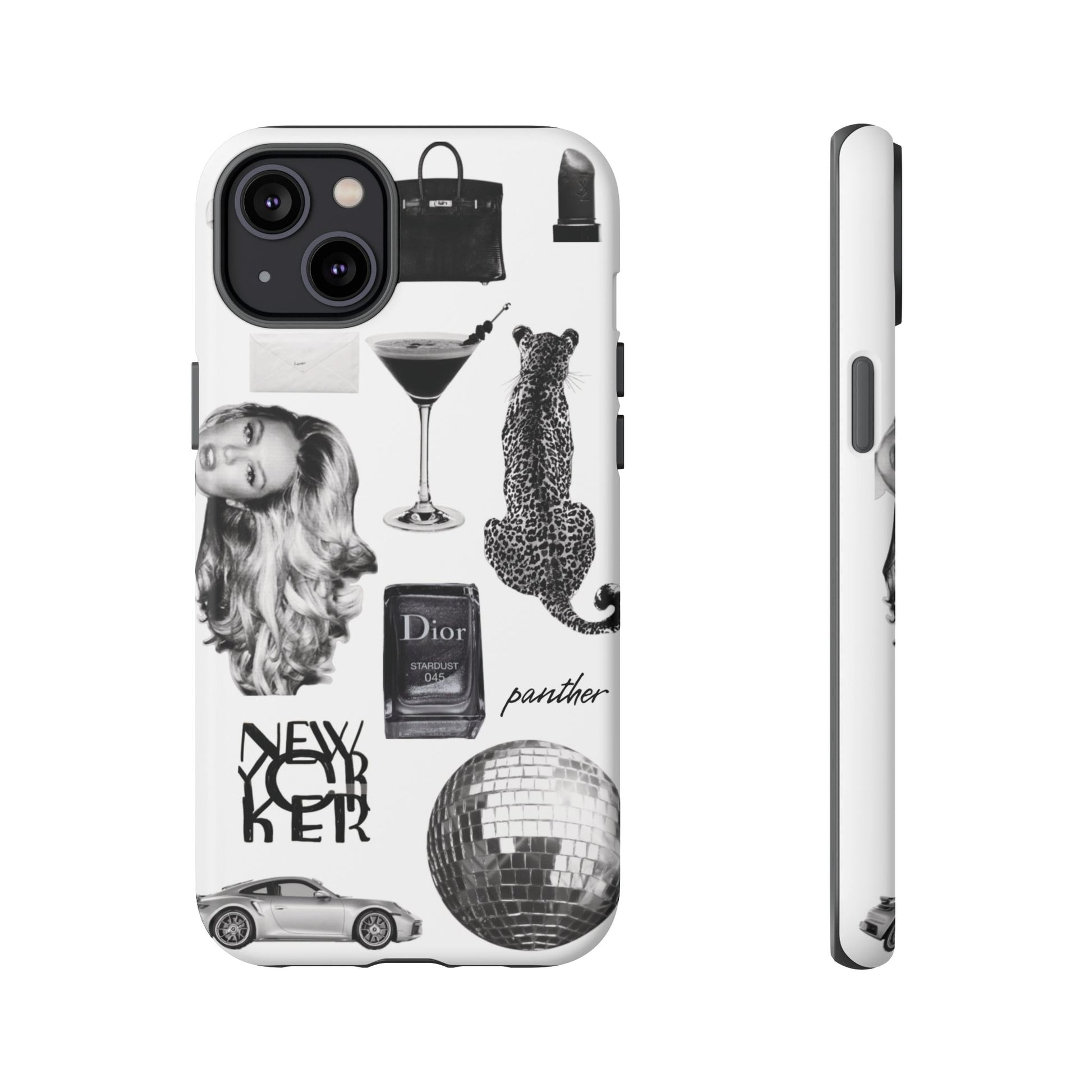 This glamorous and chic phone case is perfect for anyone who loves bling and silver accents. Featuring a stylish leopard print and iconic New York and Porsche design elements, this case is sure to stand out.