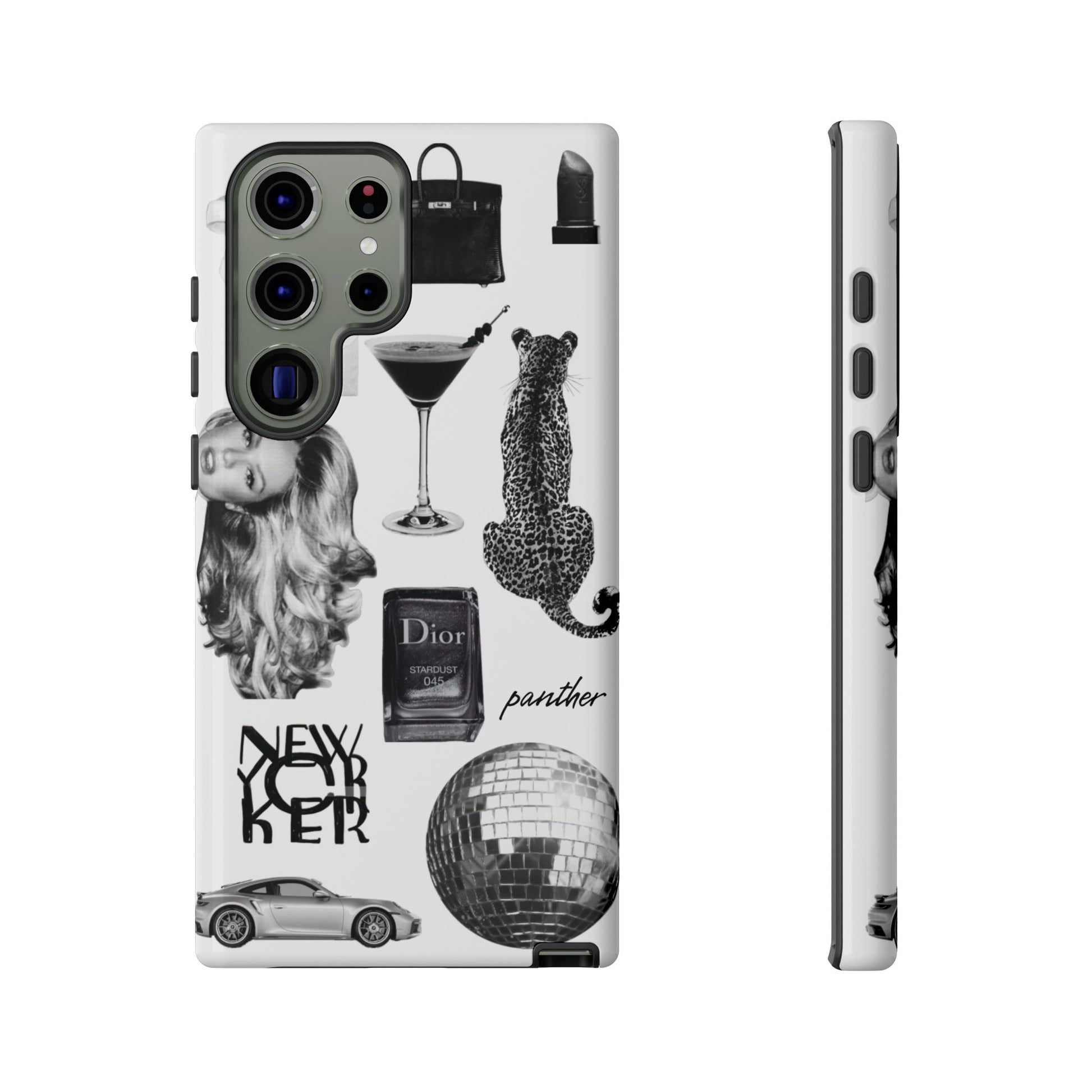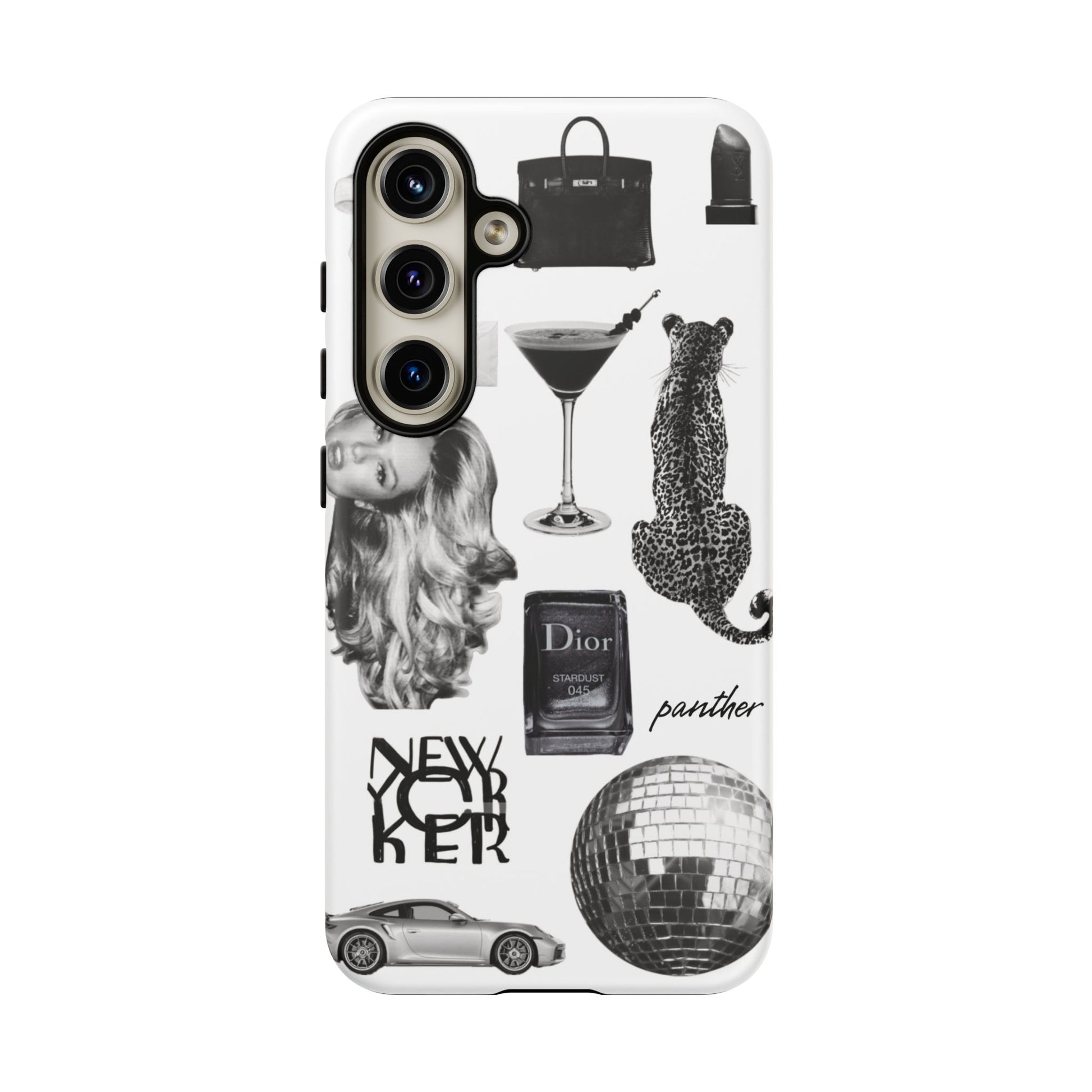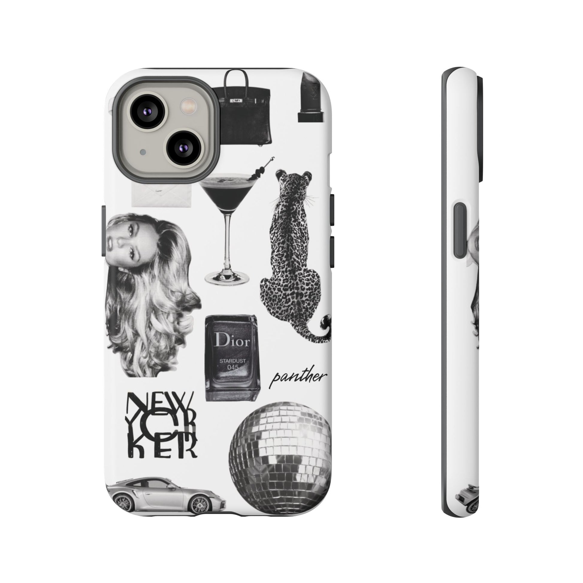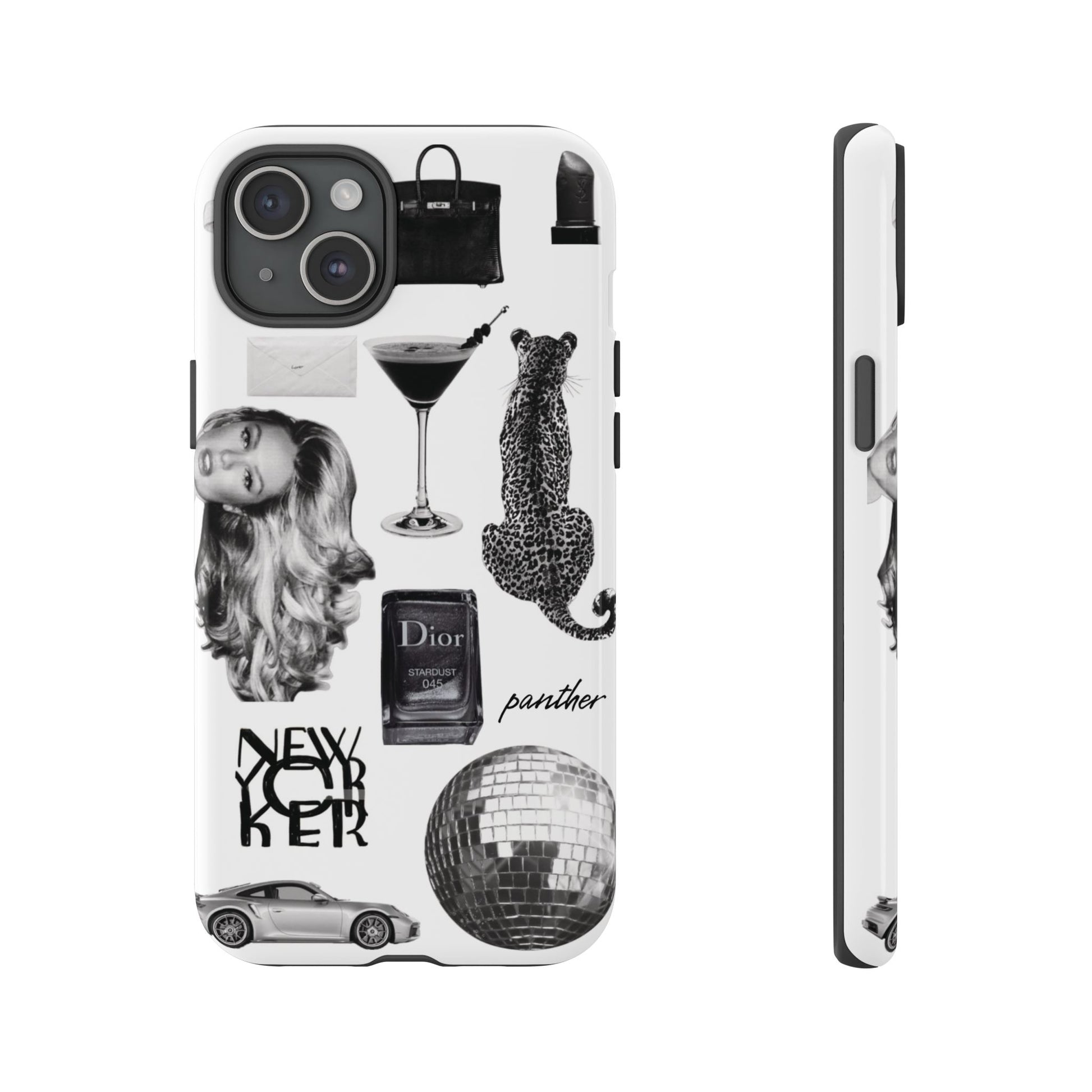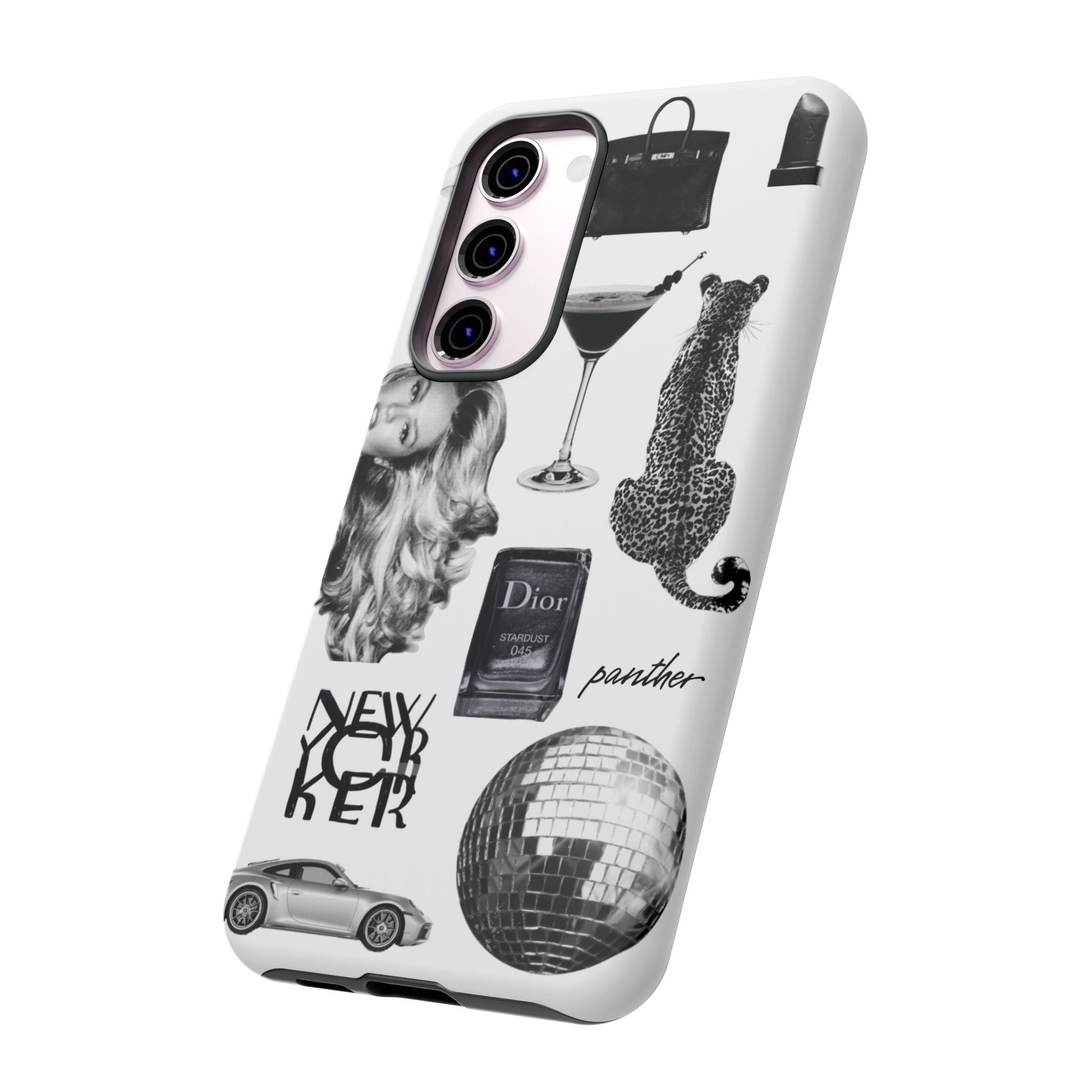 This glamorous and chic phone case is perfect for anyone who loves bling and silver accents. Featuring a stylish leopard print and iconic New York and Porsche design elements, this case is sure to stand out.