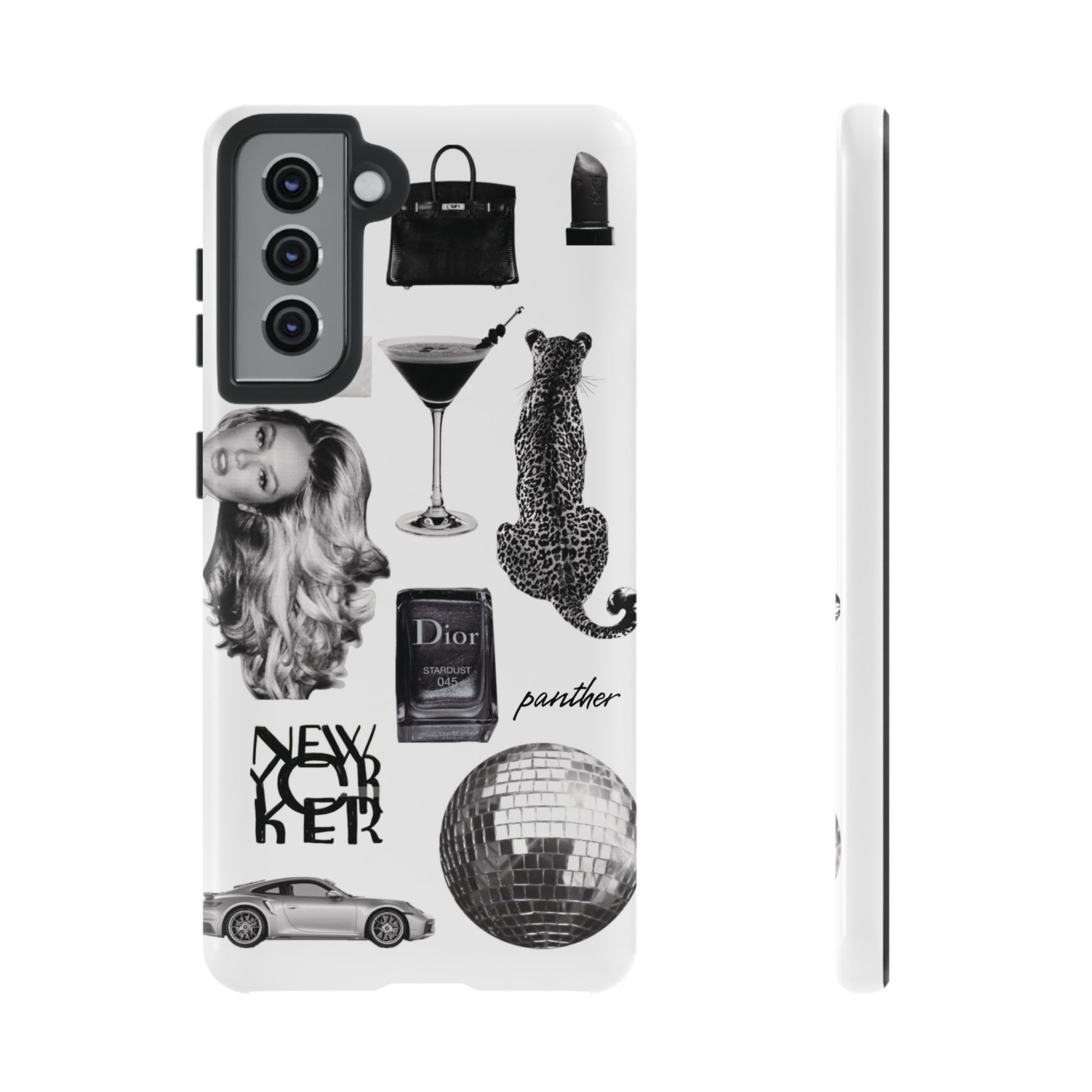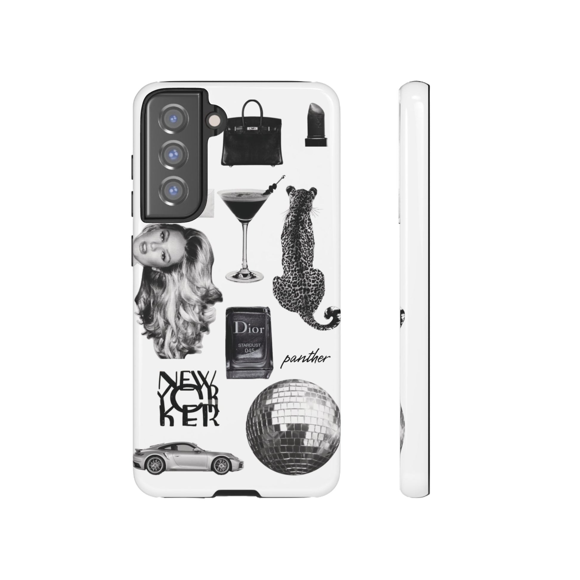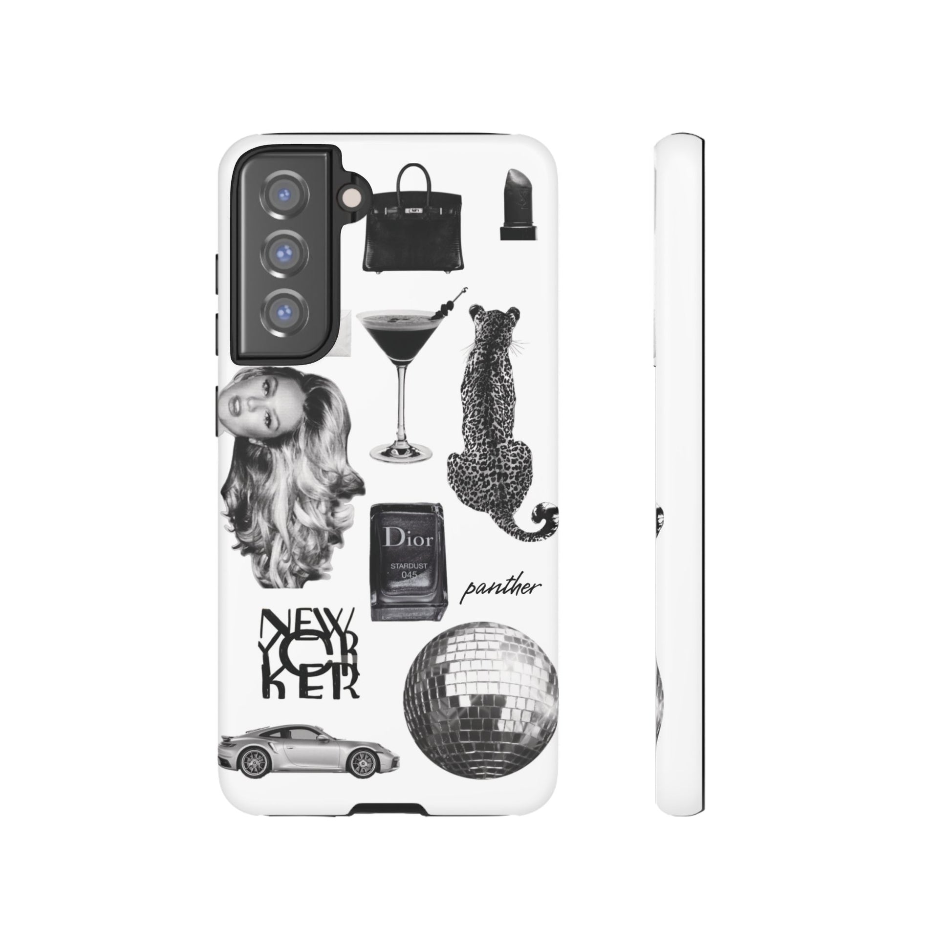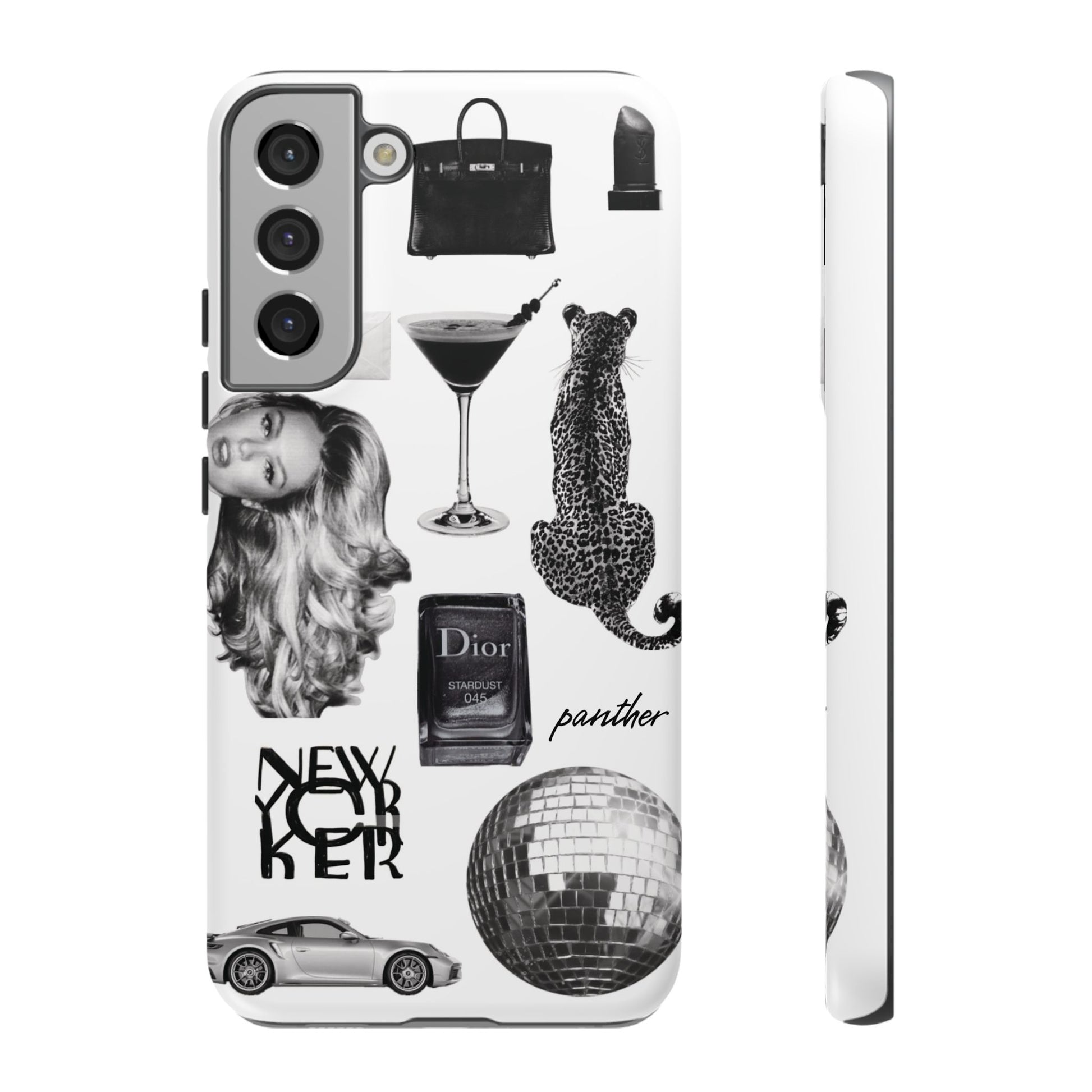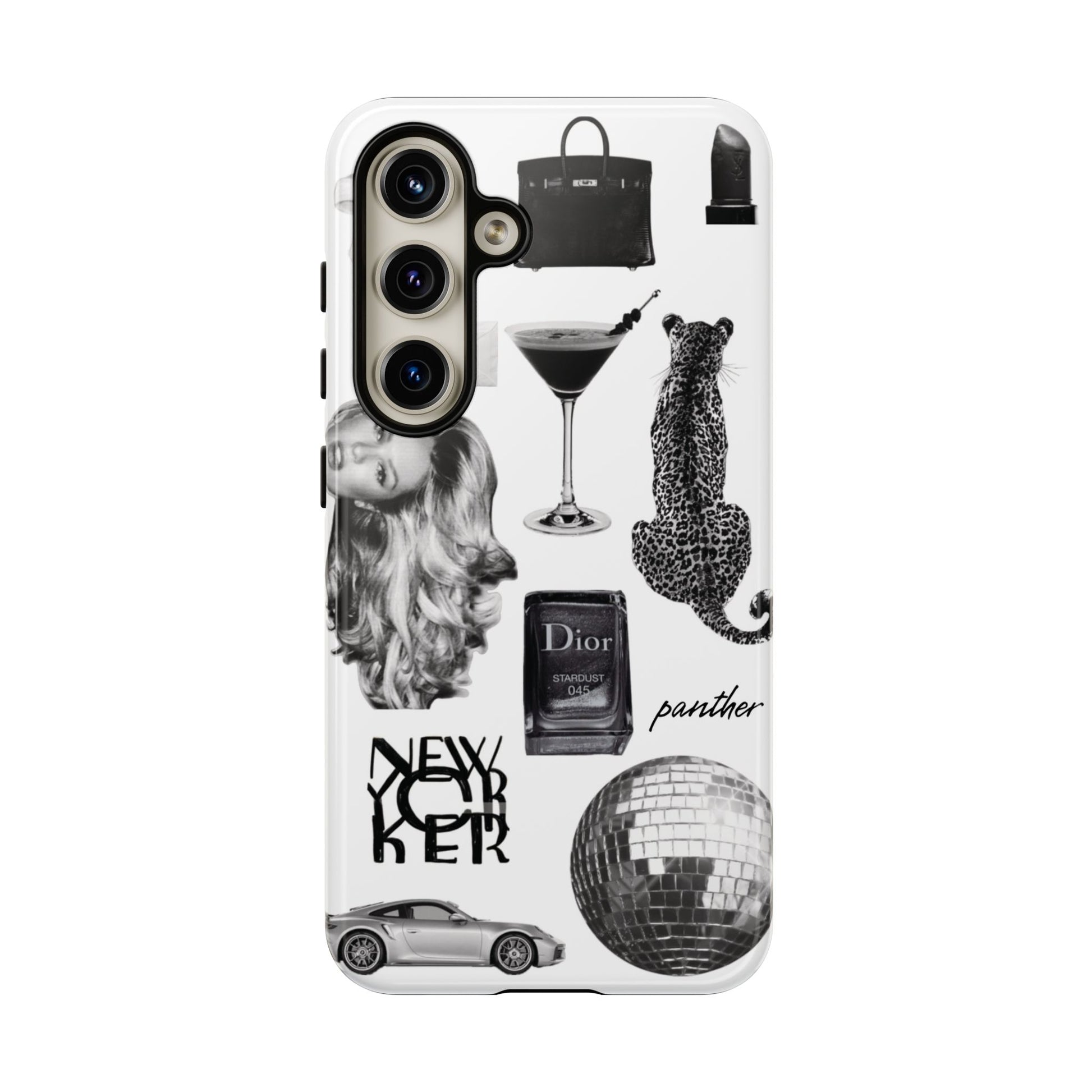 This glamorous and chic phone case is perfect for anyone who loves bling and silver accents. Featuring a stylish leopard print and iconic New York and Porsche design elements, this case is sure to stand out.