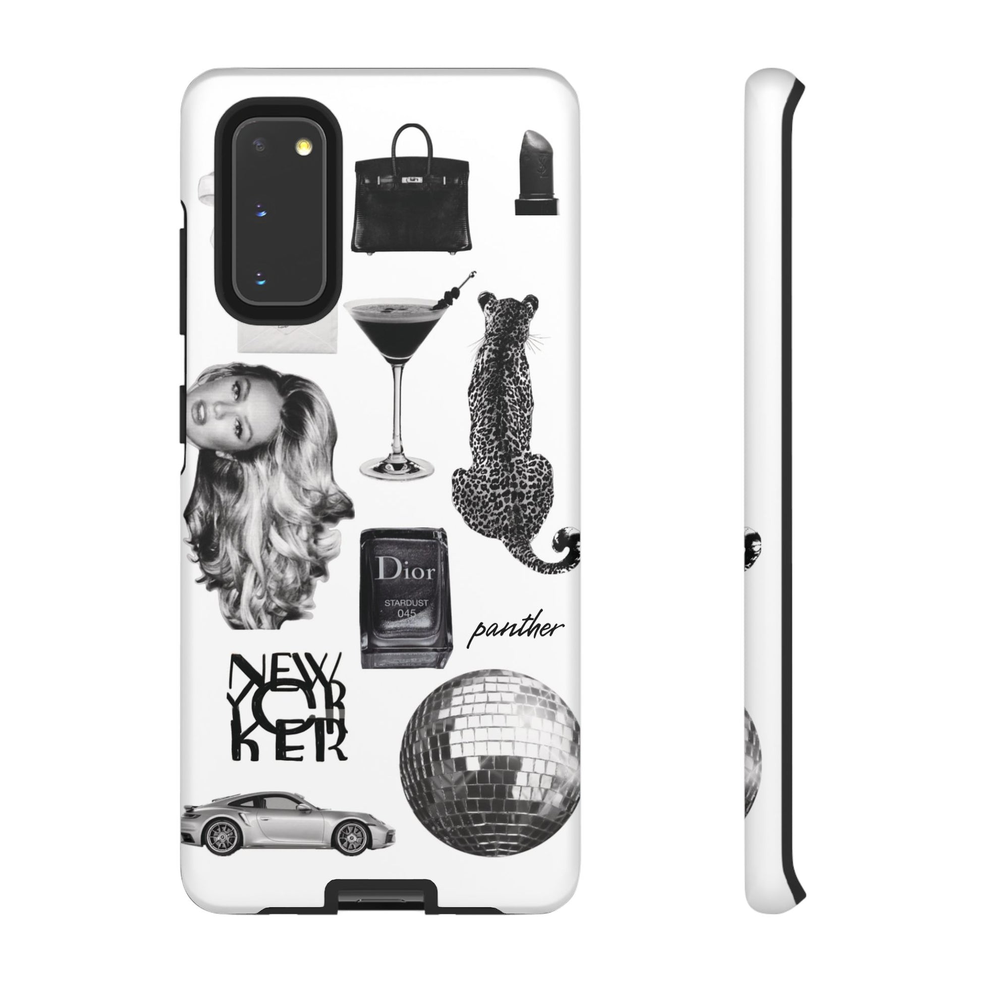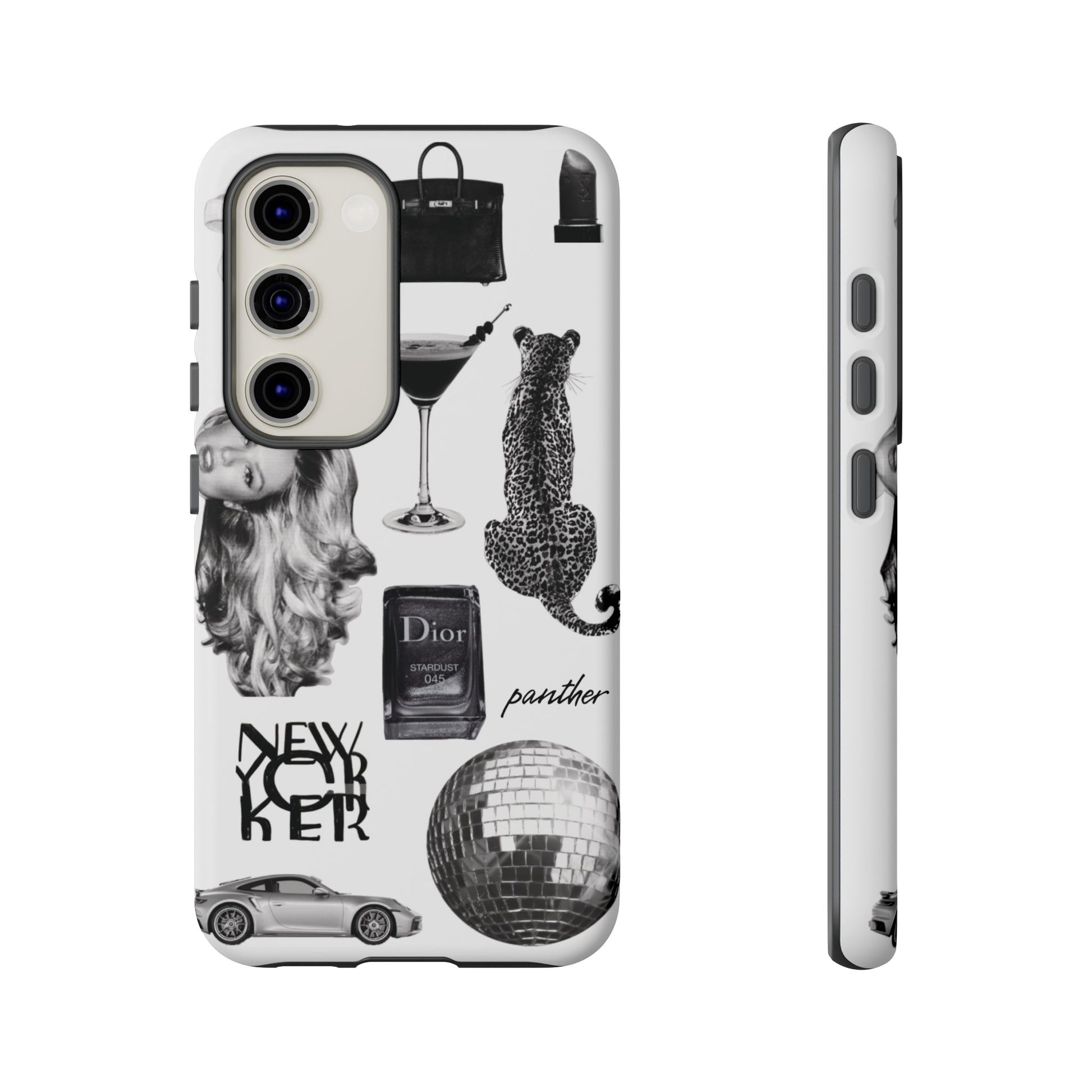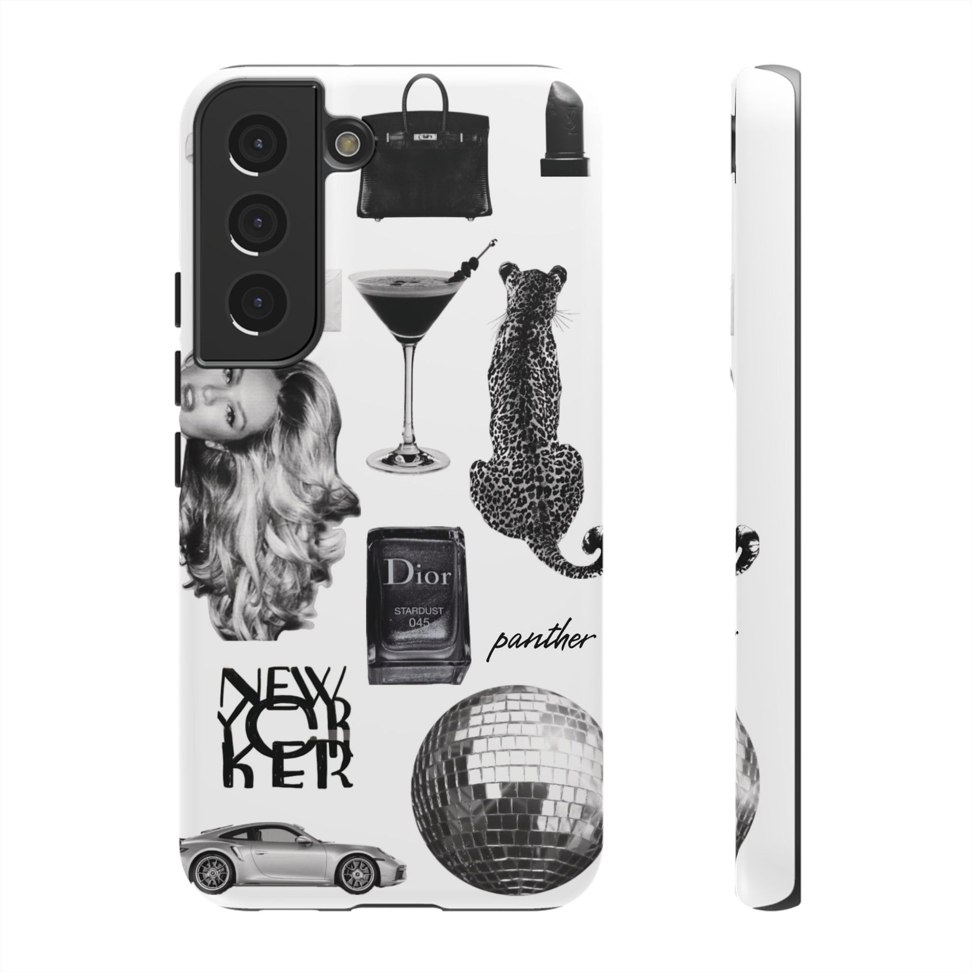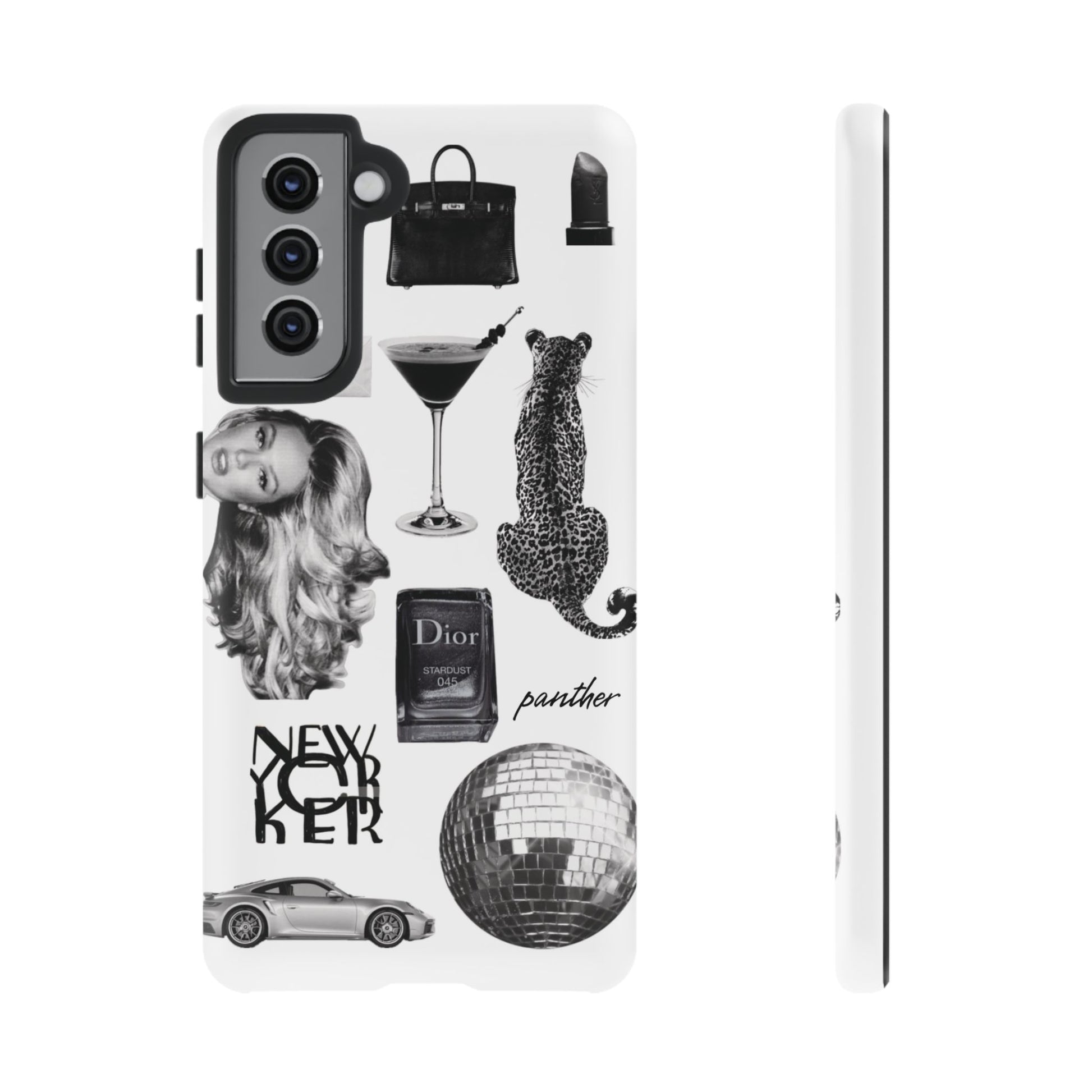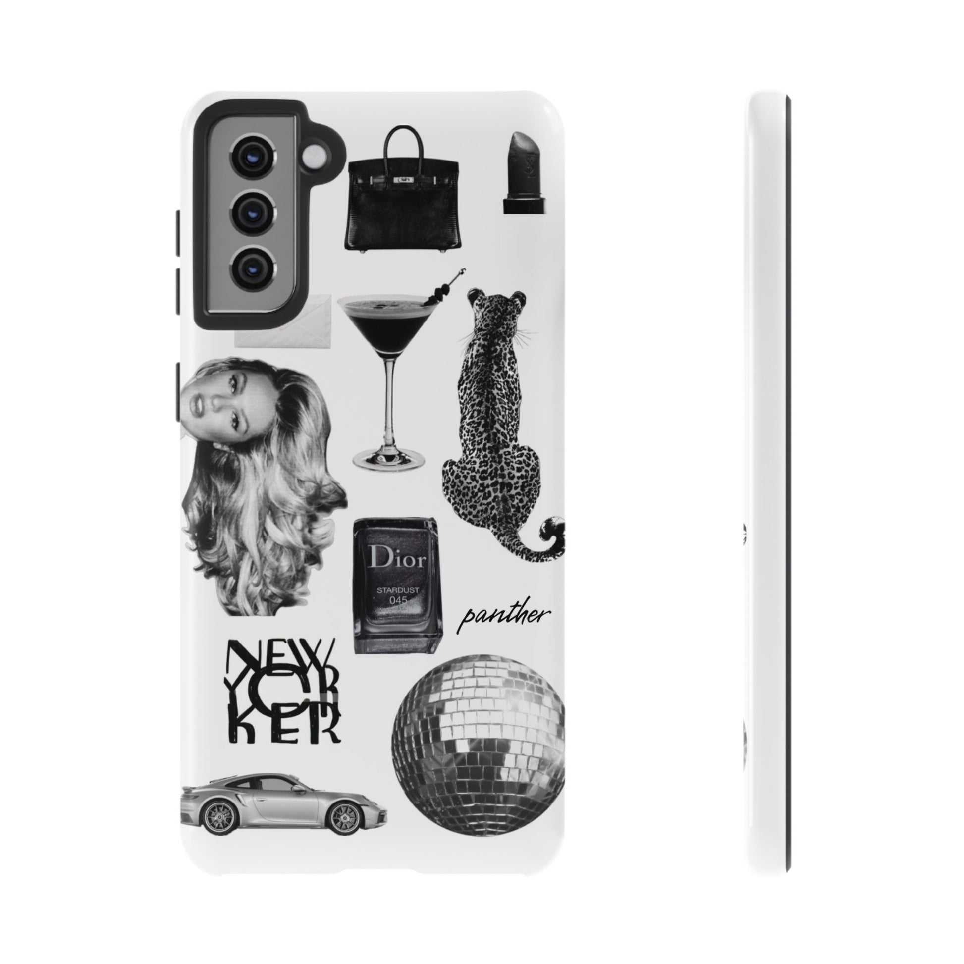 This glamorous and chic phone case is perfect for anyone who loves bling and silver accents. Featuring a stylish leopard print and iconic New York and Porsche design elements, this case is sure to stand out.
