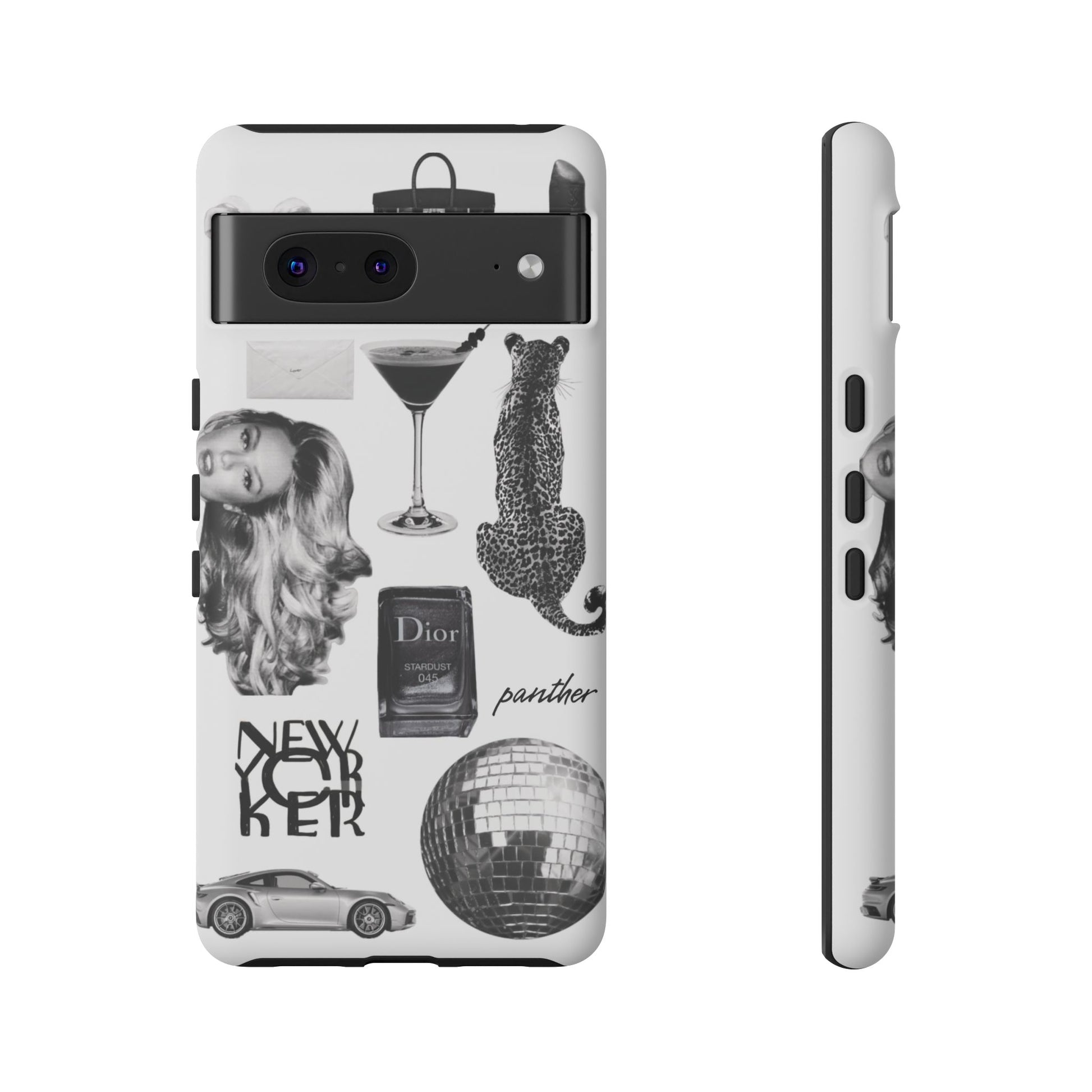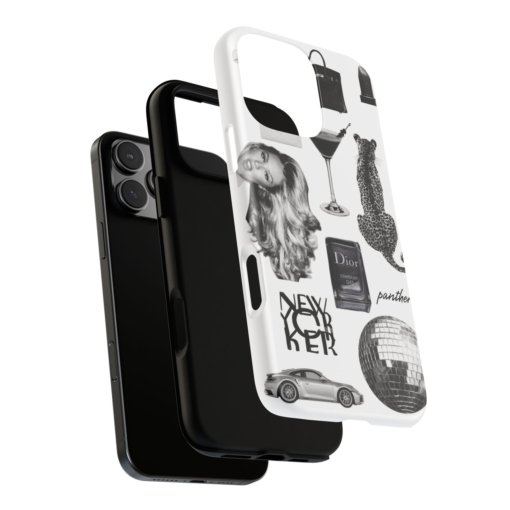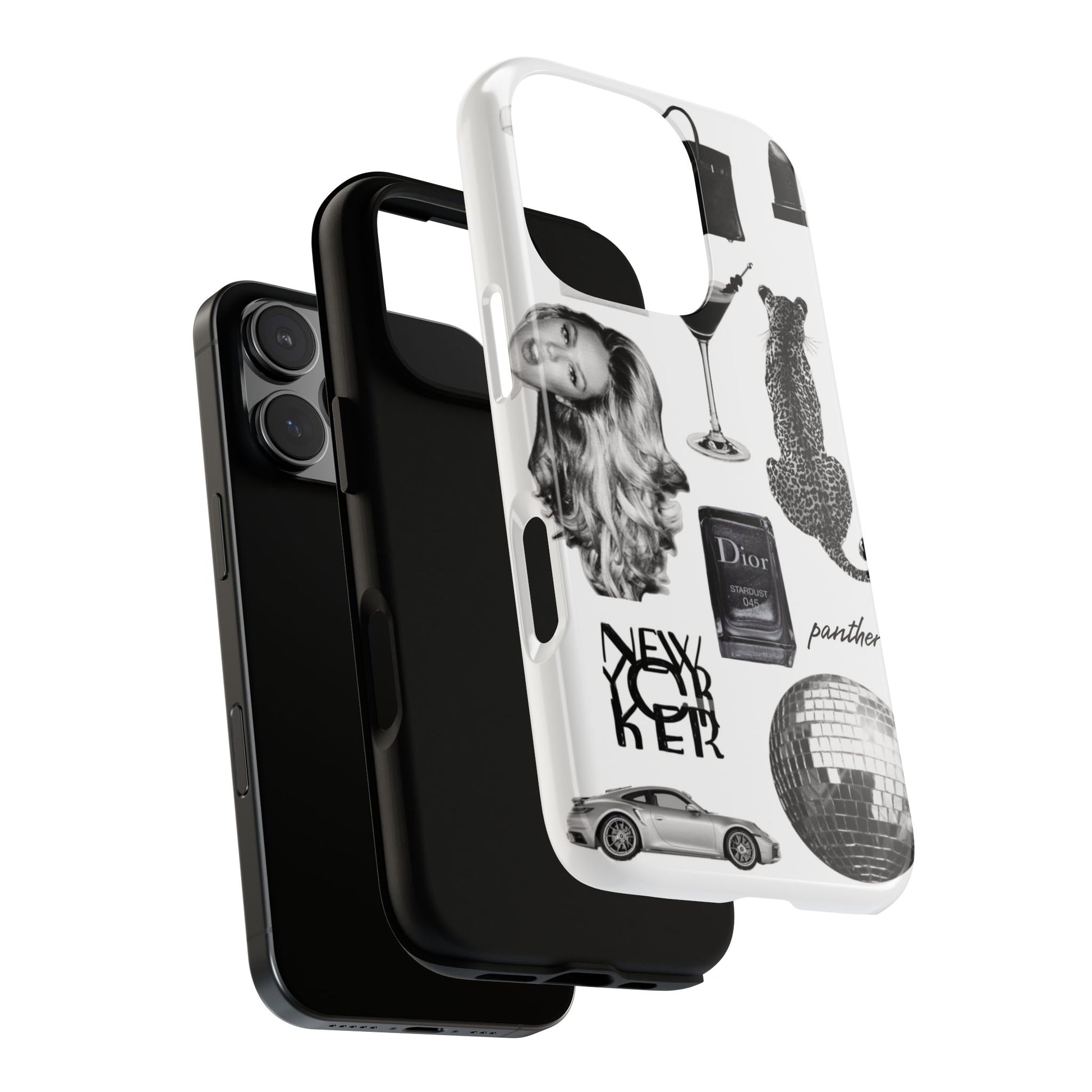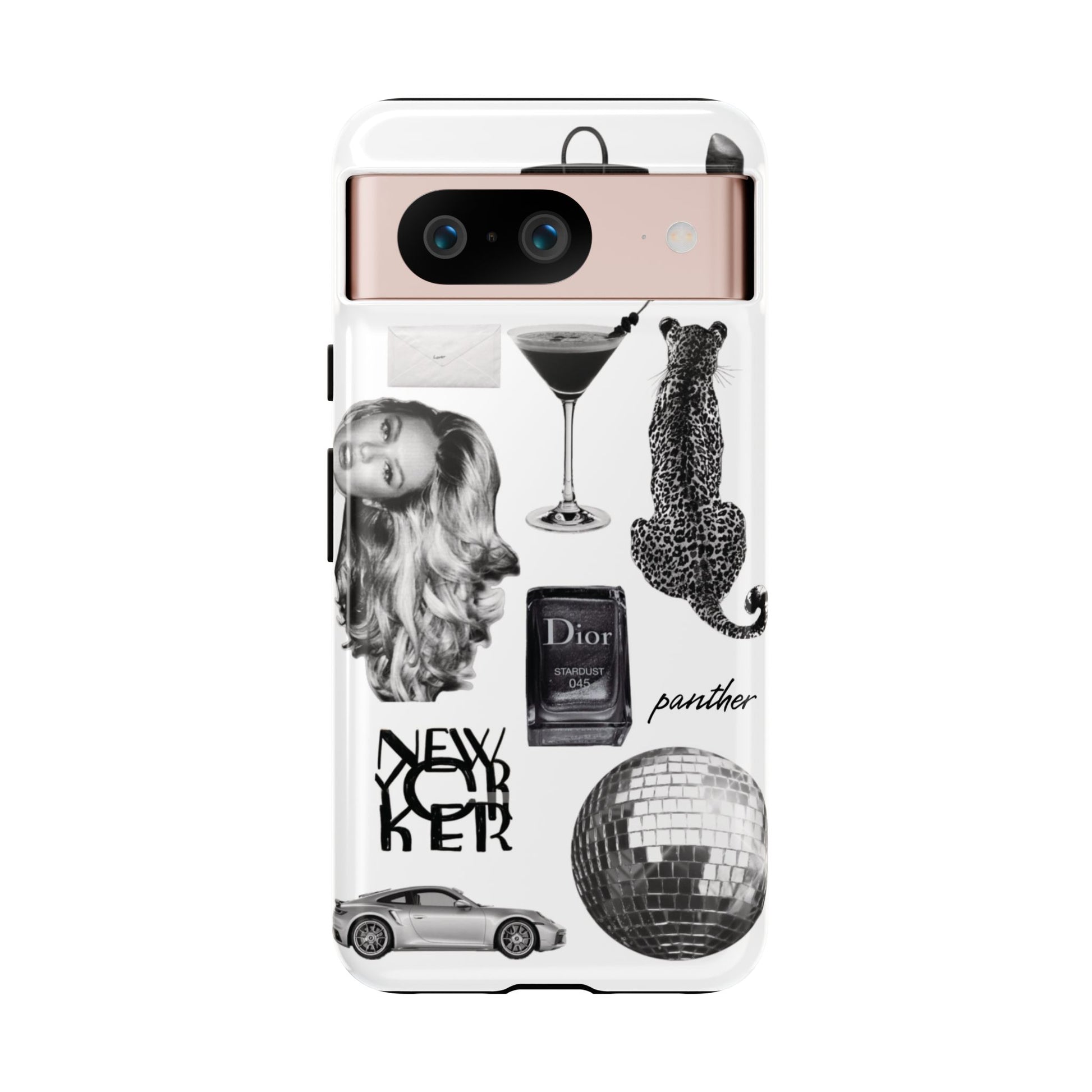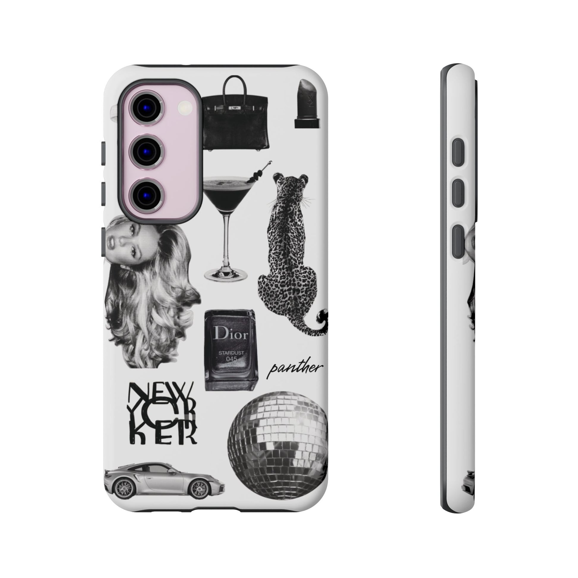 This glamorous and chic phone case is perfect for anyone who loves bling and silver accents. Featuring a stylish leopard print and iconic New York and Porsche design elements, this case is sure to stand out.